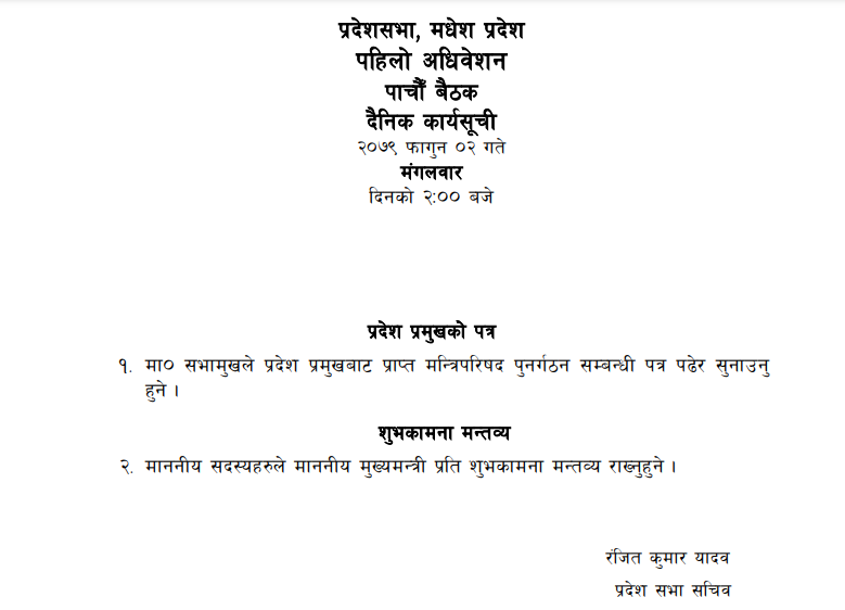 आजको बैठकमा सभामुख रामचन्द्र मण्डलले प्रदेश प्रमुख हरिशंकर मिश्रबाट प्राप्त मन्त्रिपरिषद् पुनर्गठन सम्बन्धी पत्र पढेर सुनाउने कार्यसूची रहेको प्रदेश सभा सचिवालयका सचिव रञ्जित कुमार यादवले जानकारी दिए ।
