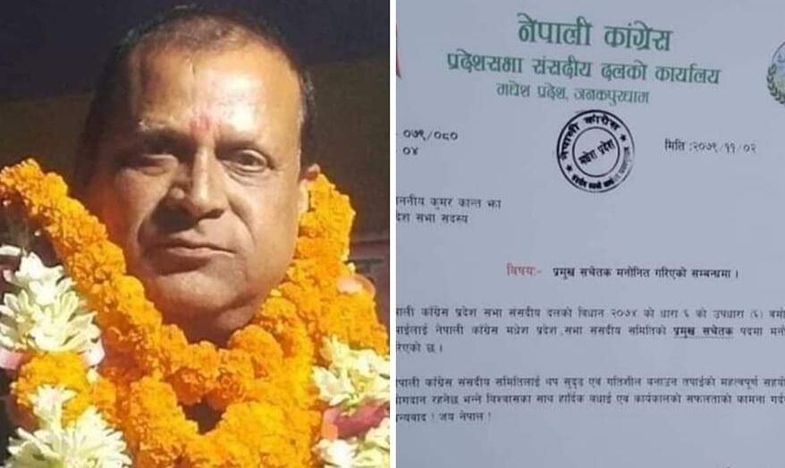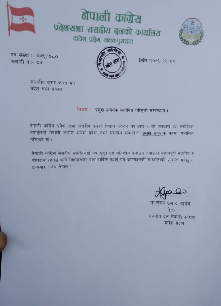 झालाई नेपाली कांग्रेस प्रदेशसभा संसदीय दलको विधान २०७४ को धारा ६ को उपधारा (६) वमोजिम पार्टीको मधेस प्रदेशसभा संसदीय समितिको प्रमुख सचेतक पदमा मनोनित गरिएको हो ।