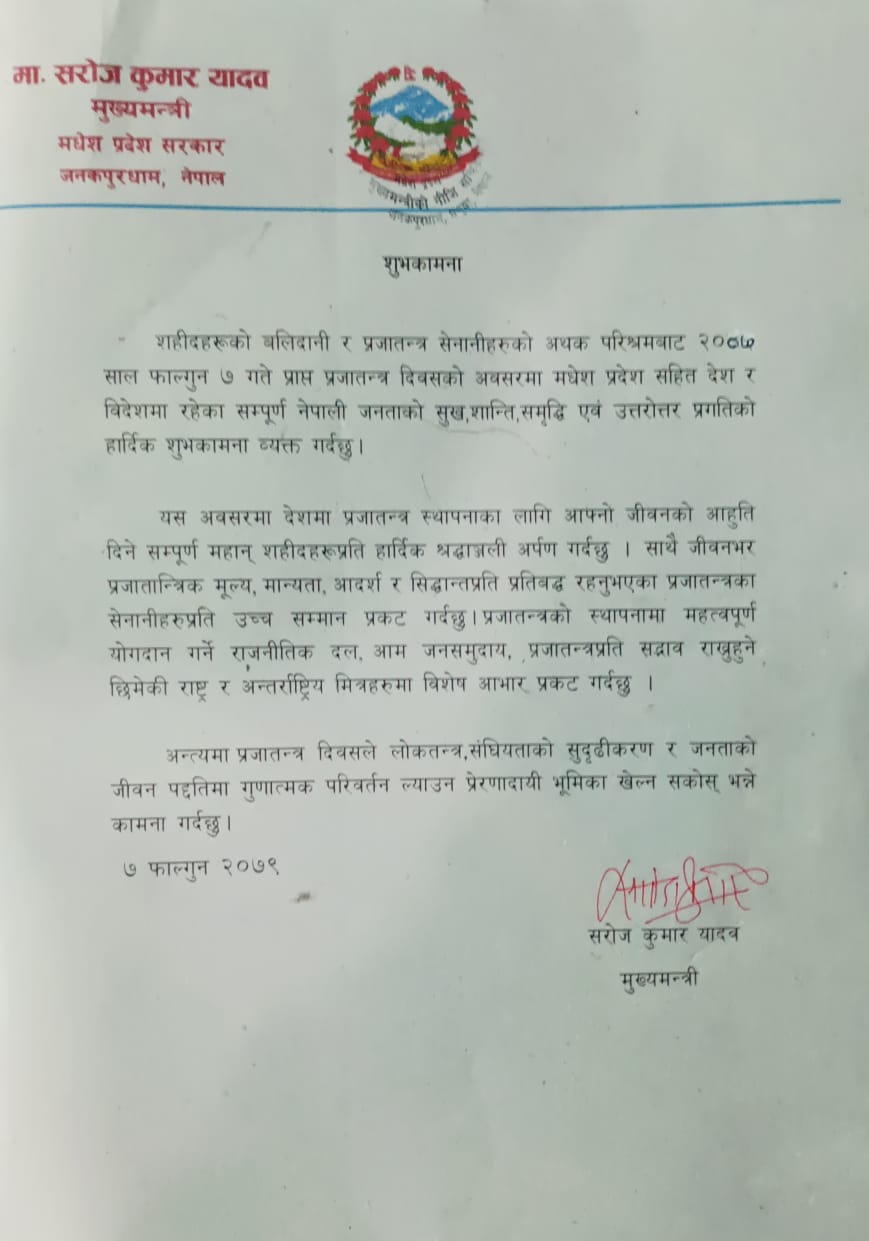 ‘शहीदहरूको बलिदानी र प्रजातन्त्र सेनानीहरुको अथक परिश्रमबाट २००० साल फागुन ७ गते प्राप्त प्रजातन्त्र दिवसको अवसरमा मधेस प्रदेशसहित देश र विदेशमा रहेका सम्पूर्ण नेपाली जनताको सुख, शान्ति, समृद्धि एवं उत्तरोत्तर प्रगतिको हार्दिक शुभकामना व्यक्त गर्दछु ।’ मुख्यमन्त्री यादवले जारी गरेको विज्ञप्तिमा उल्लेख छ ।