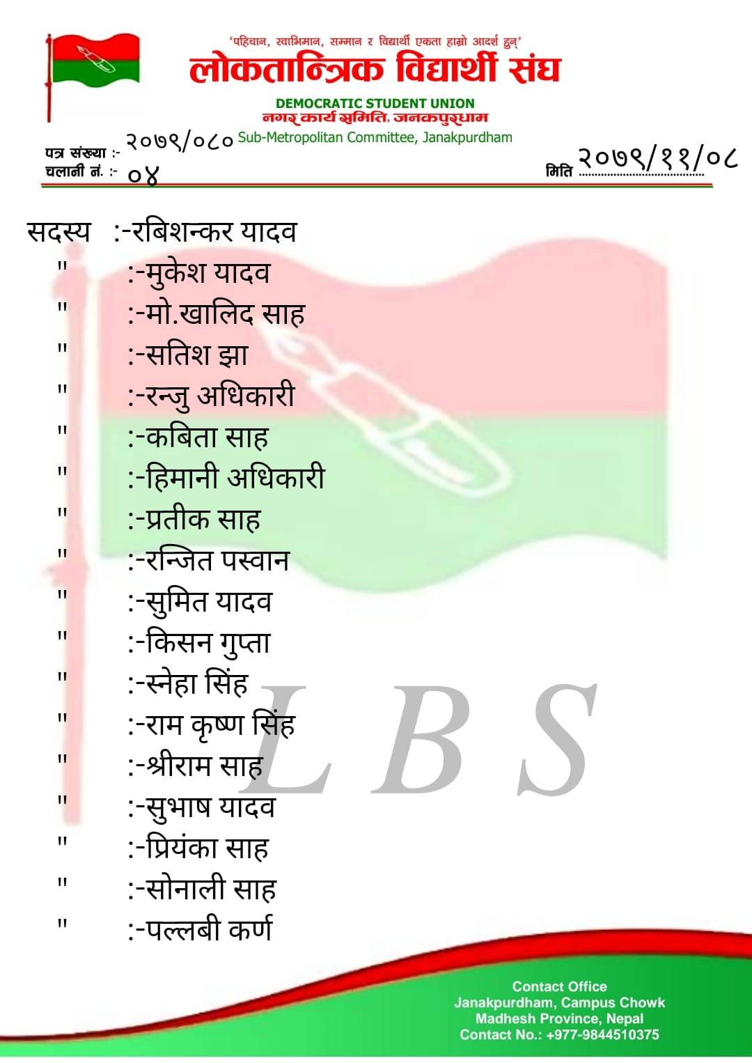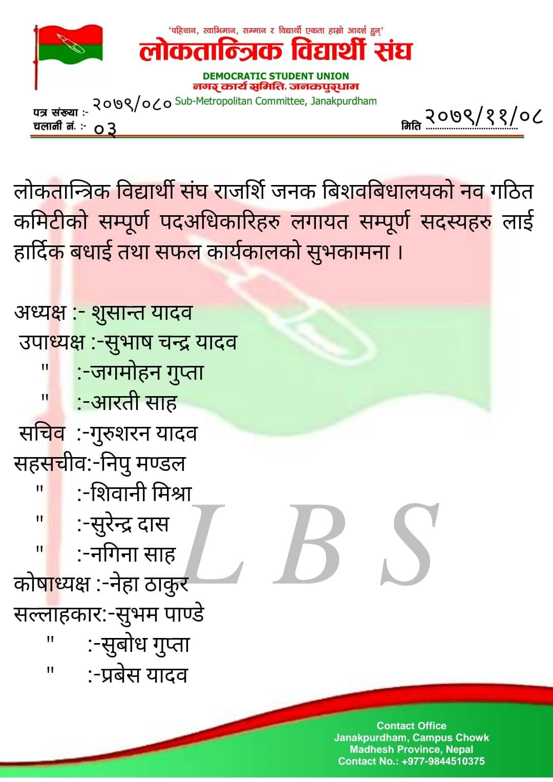 त्रिभुवन विश्वविद्यालयको विभिन्न कलेजहरुमा हुने स्वतन्त्र विद्यार्थी युनियनको निर्वाचनलाई मध्यनजर गर्दै जनकपुरधाम उपमहानगरपालिका वडा नम्बर–८ स्थित राजर्षि जनक विश्वविद्यालयमा लोकतान्त्रिक विद्यार्थी संघका सभापति सुशान्त यादवको नेतृत्वमा ५१ सदस्यीय कमिटी गठन गरिएको छ ।