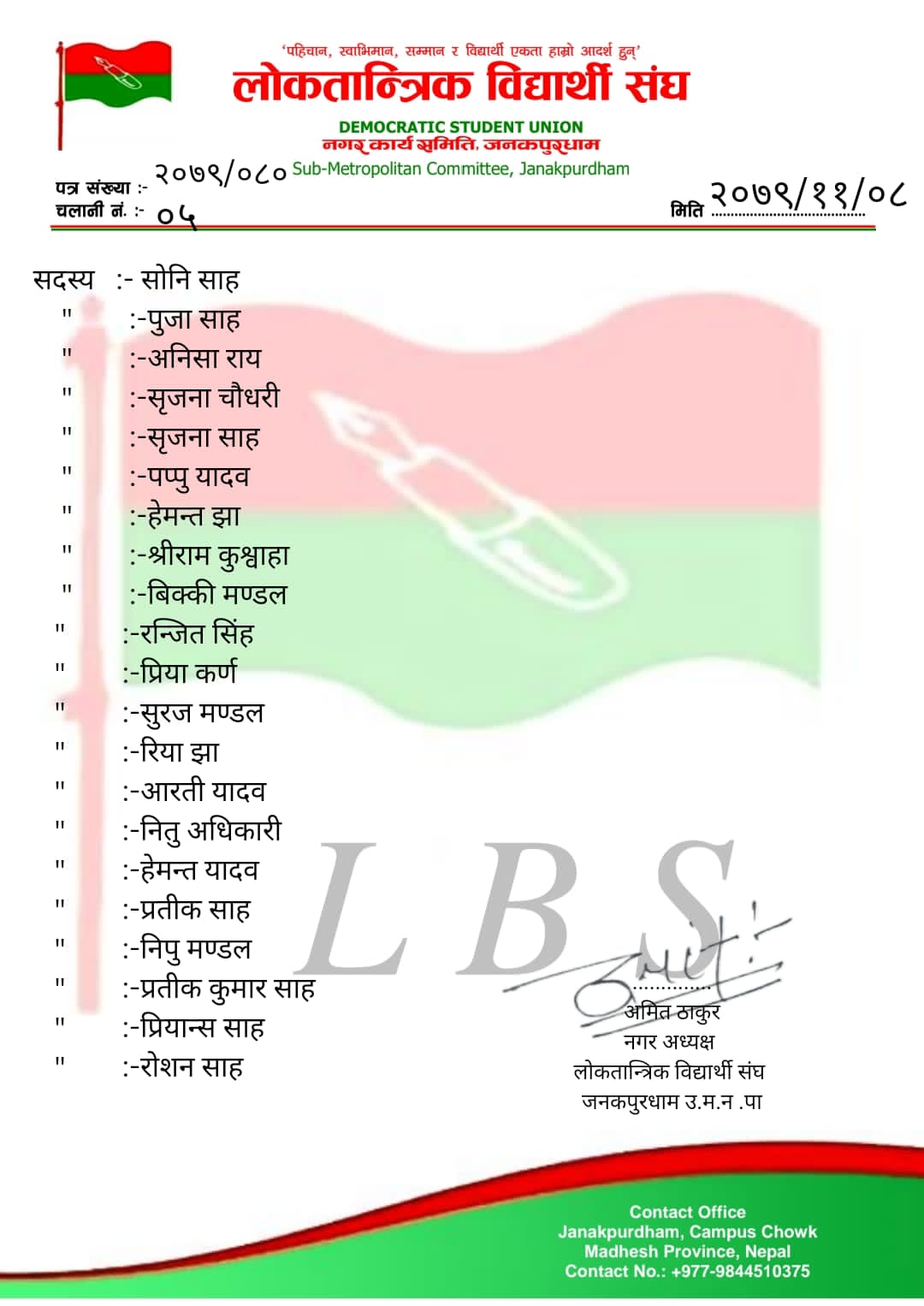सोही क्रममा लोकतान्त्रिक समाजवादी पार्टी नेपाल निकट लोकतान्त्रिक विद्यार्थी संघले सोमबार जनकपुरधाममा निर्वाचनलाई केन्द्रित गर्दै कमिटी गठन गरेको हो ।