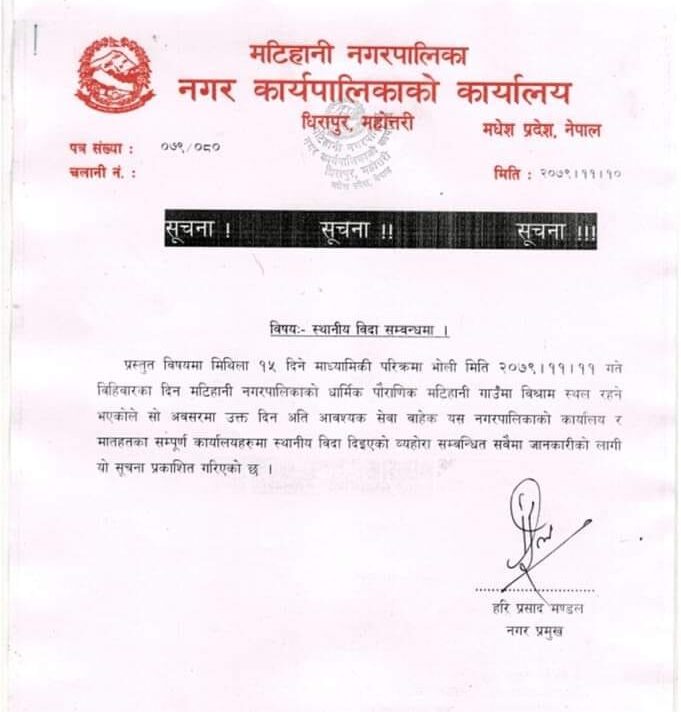 मटिहानी नगरपालिकामा आज सार्वजनिक बिदा