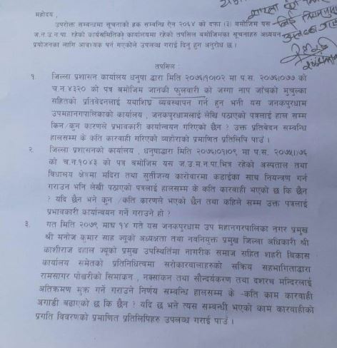 सूचनामा जिल्ला प्रशासन कार्यालय धनुषाद्वारा २०७६ माघ २ गते जारी गरिएको पत्र बमोजिम जानकी फुलवारीको जग्गा नापजाँचको मुचुल्कासहितको प्रतिवेदनलाई यथाशिघ्र व्यवस्थापन गर्न उपमहानगरलाई पठाएको पत्रलाई हालसम्म प्रभावकारी कार्यान्वयन नगरिएको बारे कारण माग गरिएको छ ।