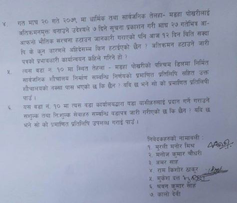 सूचनामा गत माघ २० गते धार्मिक तथा सार्वजनिक तेलहा–मडहा पोखरीलाई अतिक्रमणमुक्त बनाउने उदेश्यले ७ दिने सूचना प्रकाशन गरी माघ २७ गतेभित्र आ–आफ्नो भौतिक संरचना हटाउन जानकारी गराएको १२ दिन बितिसक्दा समेत कुन कारणले अहिलेसम्म किन हटाईएको छैन ? अतिक्रमण हटाउन जारी गरिएको पत्रको प्रभावकारी कार्यान्वयन कहिले गर्ने ? मडहा पोखरीको पश्चिम डिलमा निर्मित सार्वजनिक शौचालयको नक्सा पास भएको छ कि छैन ? वडा नम्बर–१० को वडा कार्यालयद्वारा वडावासीहरुलाई प्रदान गरिने सशुल्क तथा निःशुल्क सेवाहरु सम्बन्धि वडापत्र जारी गरिएको छ कि छैन ? भन्ने मागहरु समेटिएका छन् ।