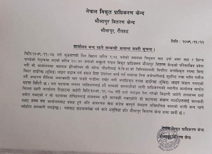 सो घटनामा संलग्न व्यक्तिहरुलाई कारवाही नभएसम्म नेपाल विद्युत प्राधिकरण मौलापुर वितरण केन्द्रबाट प्रवाह हुने अतिआवश्यक सेवाबाहेक सम्पूर्ण सेवाहरु अनिश्चितकालका लागि बन्द गरिएको हो ।