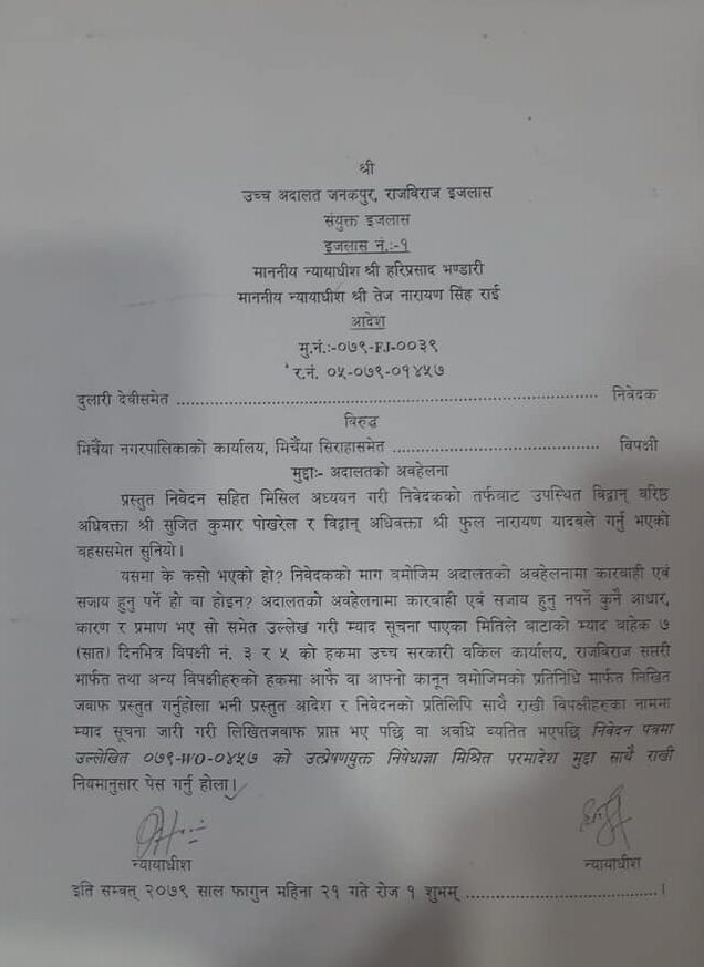 उच्च अदालत जनकपुर, राजविराज इजलासका न्यायाधीश हरिप्रसाद भण्डारी र तेज नारायण सिंह राईको इजलासले यस्तो आदेश दिएको छ ।