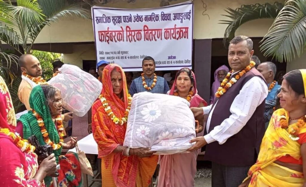वडा कार्यालयले शुक्रबार नगरप्रमुख विनयकुमार यादव र प्रमुख प्रशासकीय अधिकृत रामगुलाम कर्णको उपस्थितीमा वडा नम्बर–७ का २ सयभन्दा बढि जेष्ठ नागरिक, दलित विपन्न तथा अपाङ्गलाई फाइबार सिरक वितरण गरेको छ ।