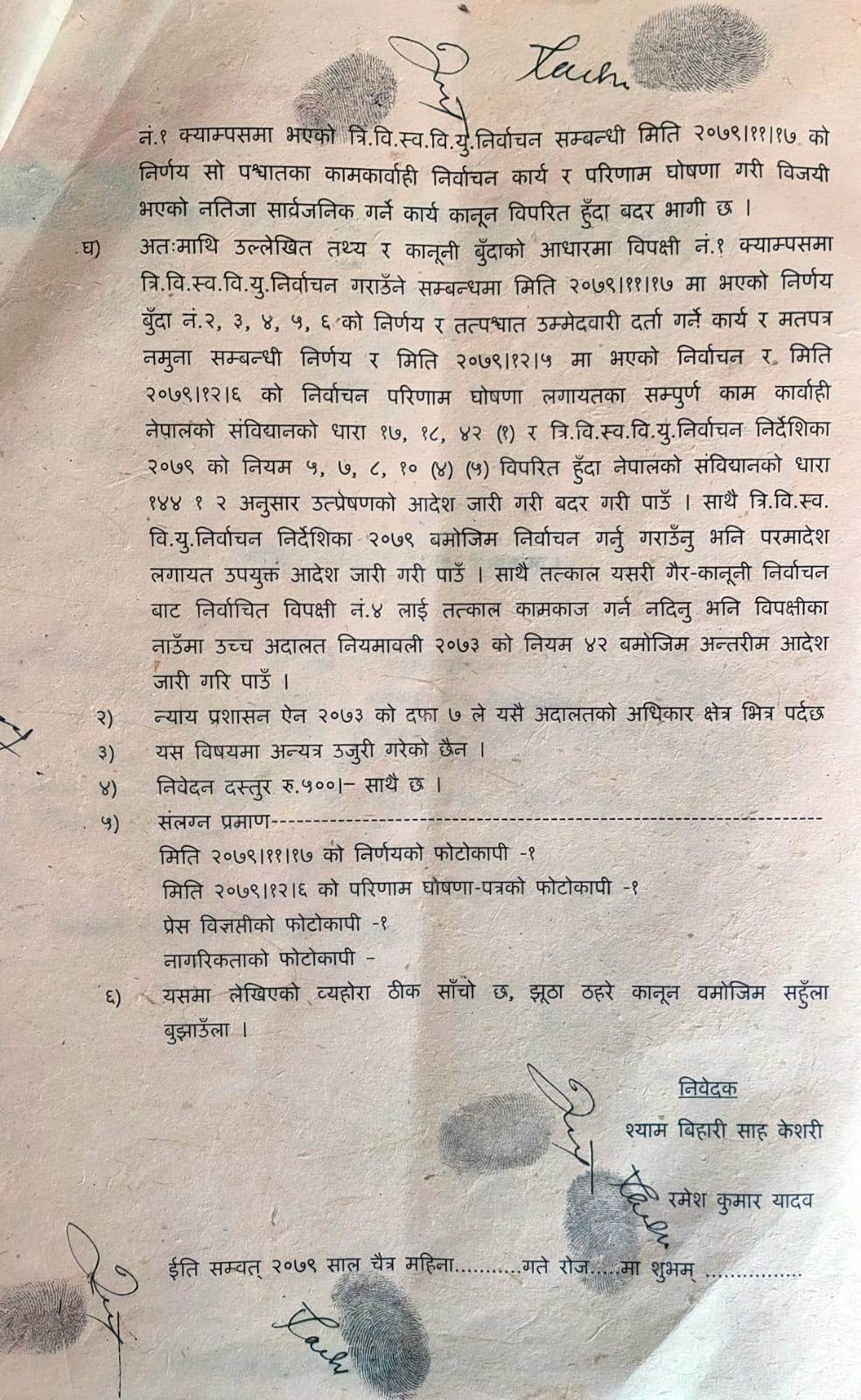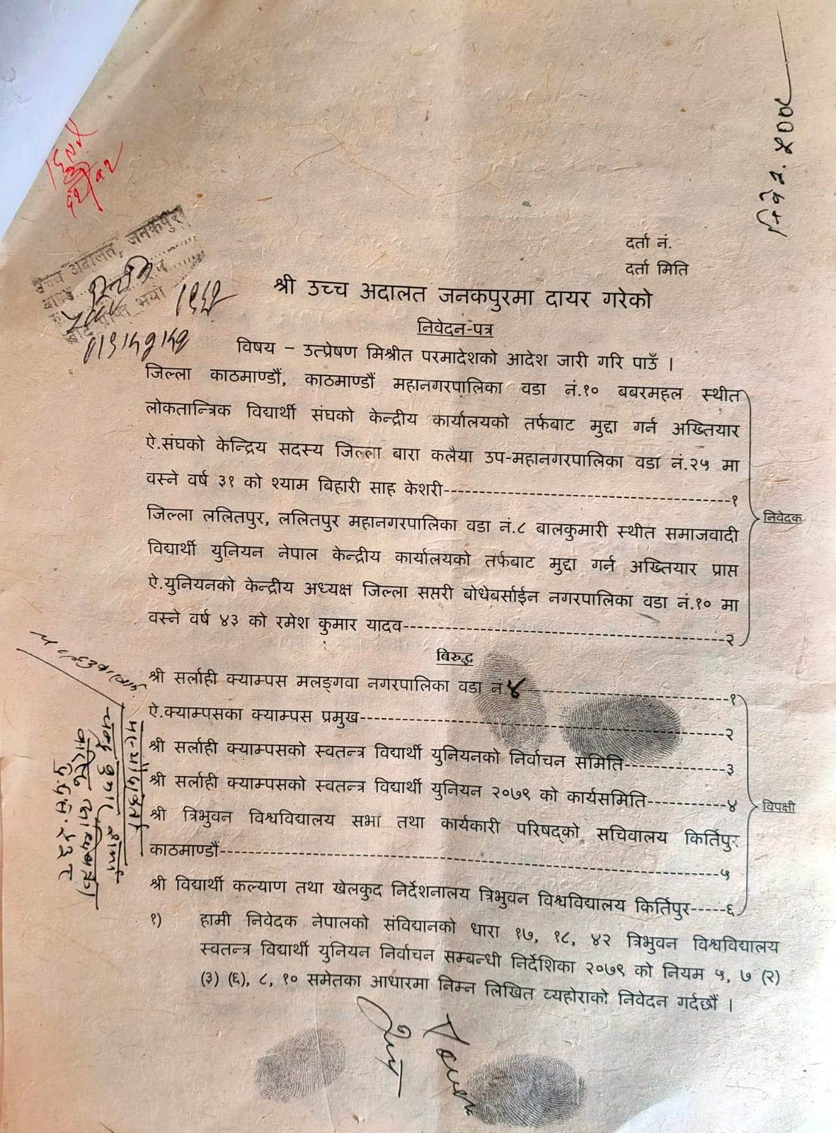 लोकतान्त्रिक विद्यार्थी संघका केन्द्रीय सदस्य श्याम बिहारी साह केशरी र समाजवादी विद्यार्थी युनियनका केन्द्रीय अध्यक्ष रमेश कुमार यादवले उत्प्रेषण मिश्रीत परमादेशको आदेश माग गर्दै उच्च अदालत, जनकपुरमा रिट दायर गरेका हुन् ।