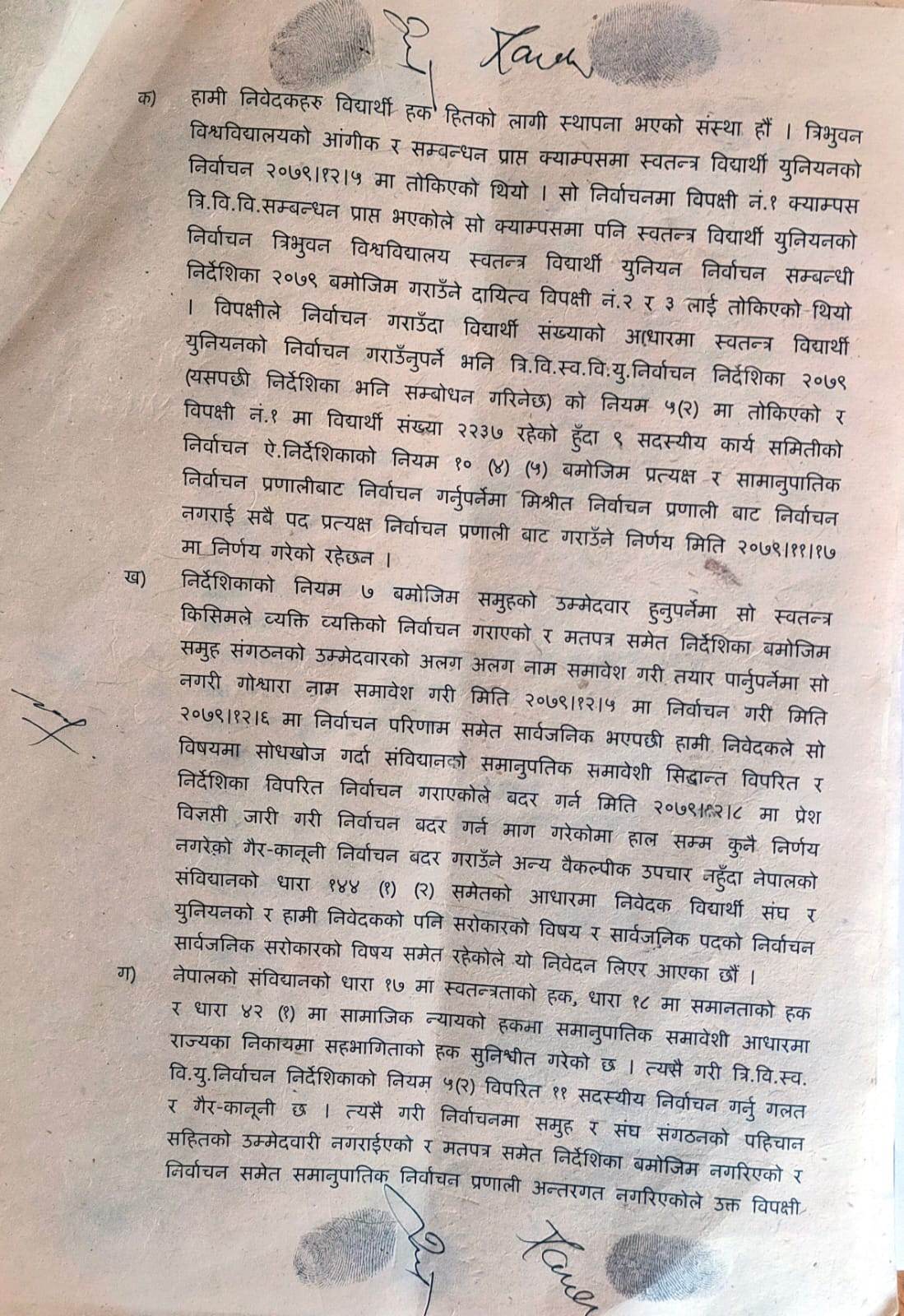 उनीहरुले सर्लाहीको मलंगवा नगरपालिका वडा नम्बर–४ स्थित सर्लाही क्याम्पस, क्याम्पसका क्याम्पस प्रमुख, सर्लाही क्याम्पसको स्वतन्त्र विद्यार्थी युनियनको निर्वाचन समिति, स्वतन्त्र विद्यार्थी युनियनको नयाँ कार्यसमिति, त्रिभुवन विश्वविद्यालय सभा तथा कार्यकारी परिषद्को सचिवालय किर्तिपुर र विद्यार्थी कल्याण तथा खेलकुद निर्देशनालय त्रिभुवन विश्वविद्यालय किर्तिपुरमाथि मुद्दा दायर गरेका छन् ।