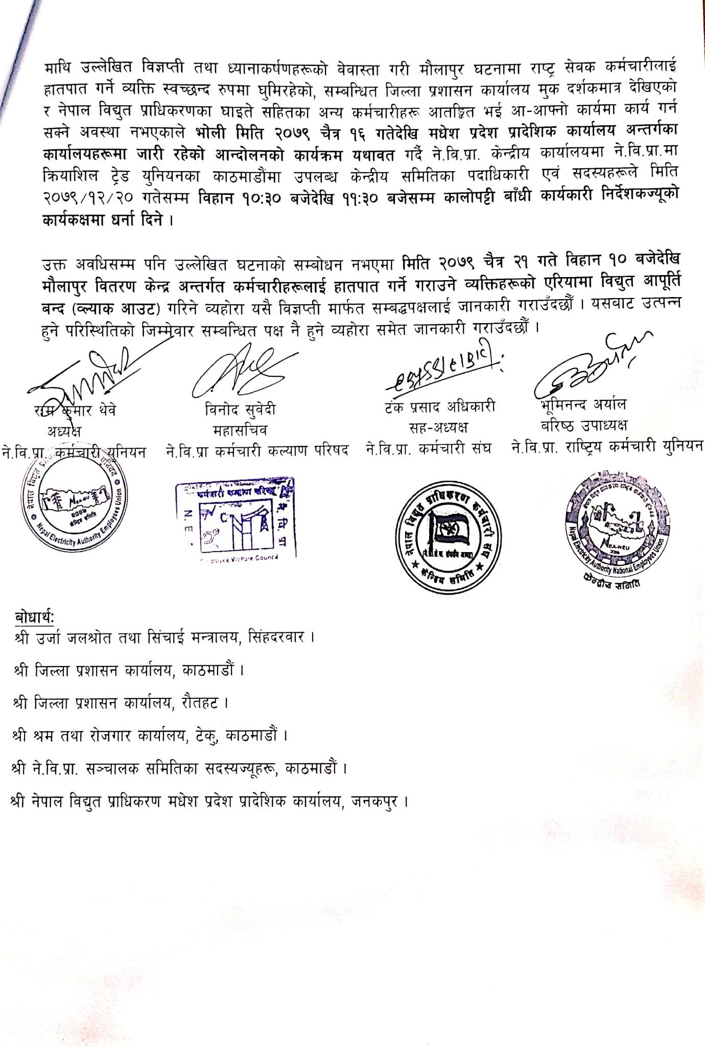 यो अवधिसम्म पनि दोषीमाथि कारबाही नभएमा २१ चैत बिहान १० बजेदेखि मौलापुर वितरण केन्द्रअन्तर्गत कर्मचारीलाई हातपात गर्ने गराउने व्यक्तिको क्षेत्रमा विद्युत आपूर्ति बन्द (ब्ल्याक आउट) गरिने पनि संगठनहरूले चेतावनी दिएका छन् ।