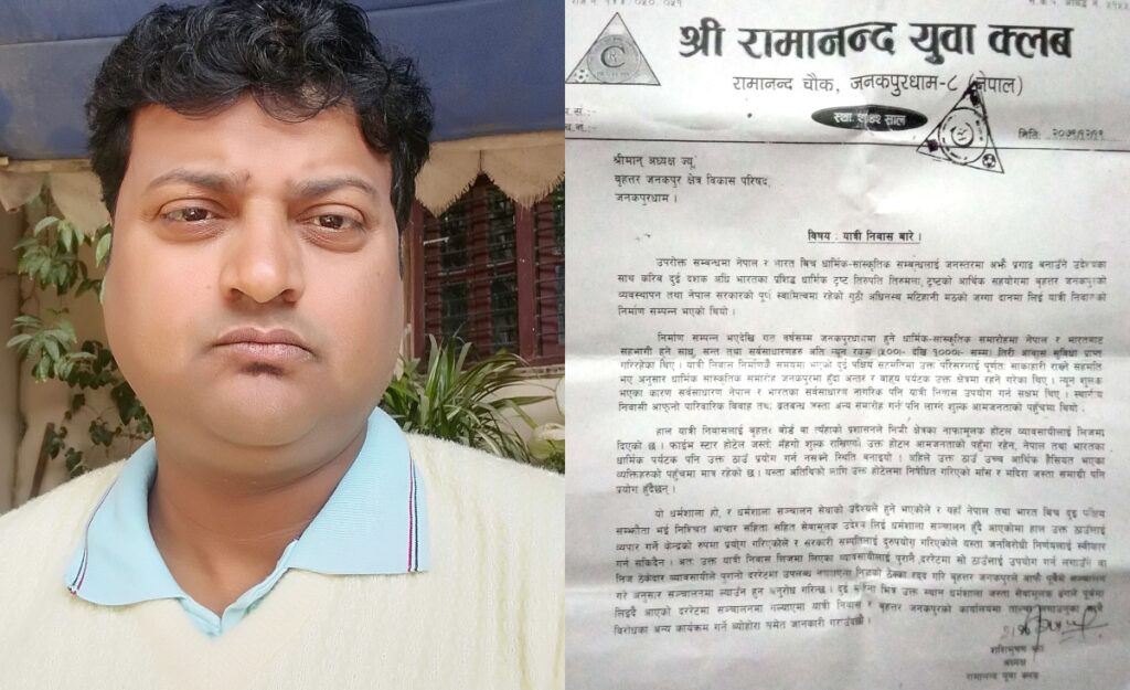 जनकपुरधाम, २२ चैत । आफ्नो धर्म संस्कृतिको रक्षाका लागि निरन्तर सक्रिय जनकपुरधामस्थित रामानन्द युवा क्लबले बृहत्तर जनकपुर क्षेत्र विकास परिषदविरूद्ध आन्दोलन गर्ने चेतावनी दिएको छ ।