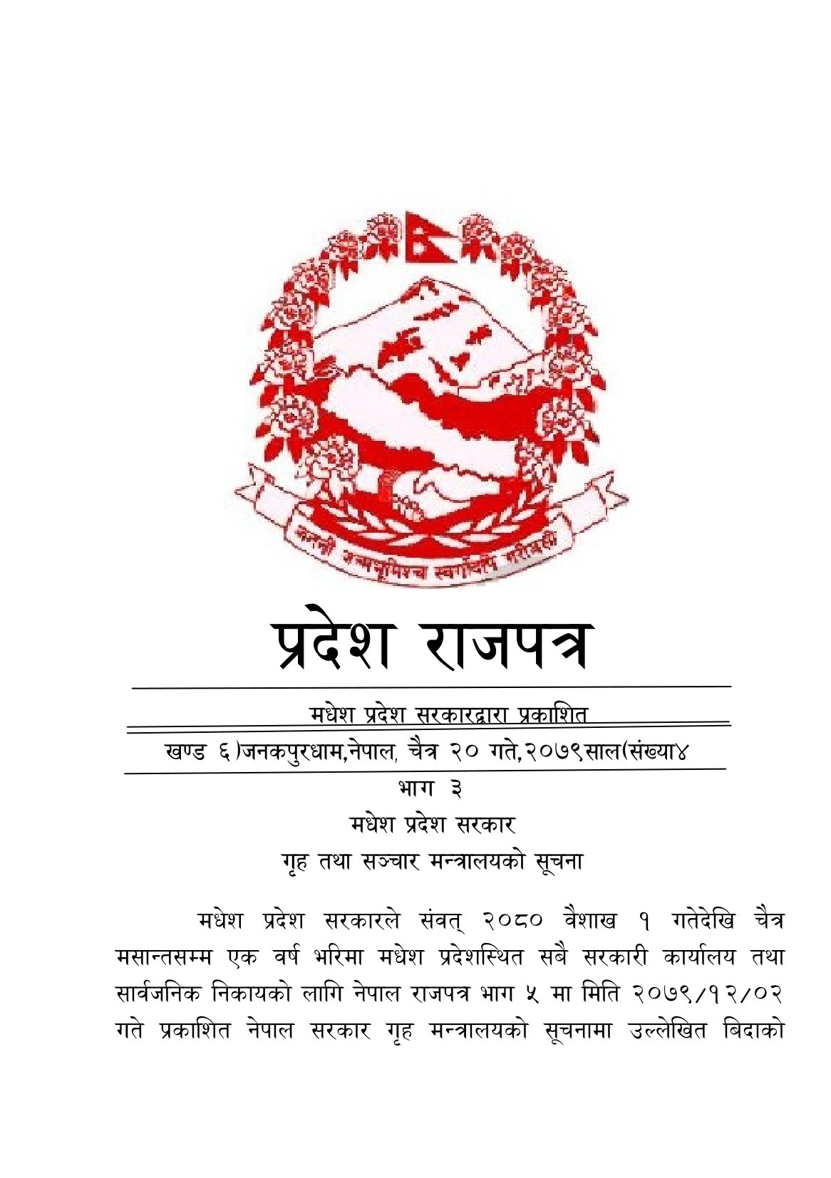 मधेस सरकारको बिदा प्रदेशस्थित सबै सरकारी कार्यालय तथा सार्वजनिक निकायमा लागू हुनेछ ।