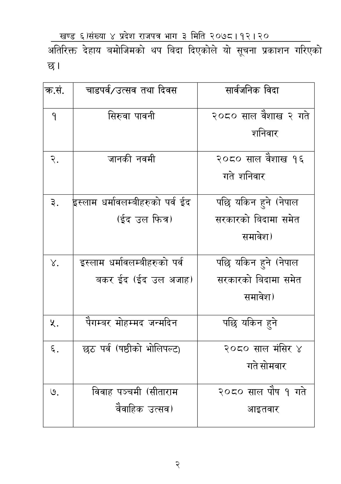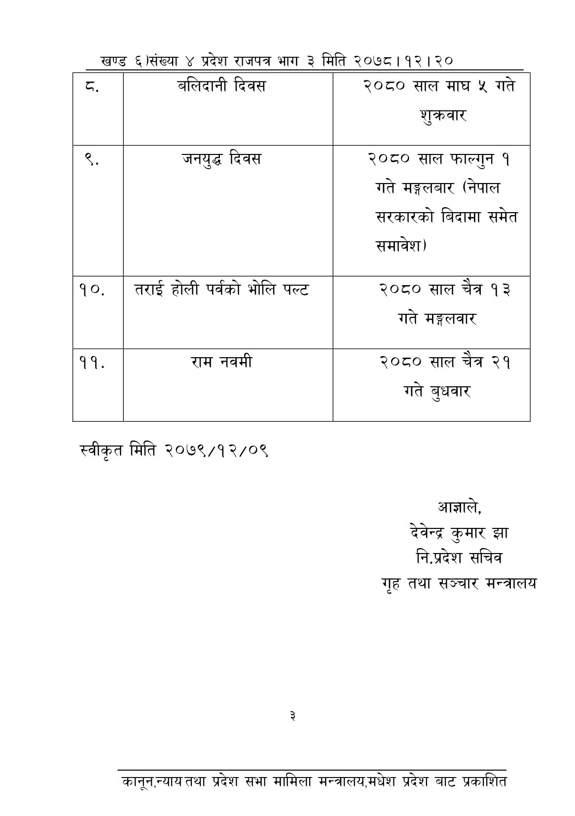 यस्तै, पुस १ गते विवाह पञ्चमी, माघ ५ गते बलिदानी दिवस, फागुन १ गते जनयुद्ध दिवस, चैत १३ गते तराई होली पर्वको भोलिपल्ट र चैत २१ गते रामनवमीको अवसरमा बिदा दिने गरि राजपत्र प्रकाशित गरिएको गृह तथा सञ्चार मन्त्रालयका निमित्त सचिव देवेन्द्र कुमार झाले जानकारी दिए ।
