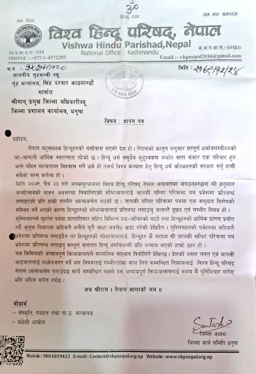 विश्व हिन्दू परिषद् नेपालले शुक्रबार धनुषाका प्रमुख जिल्ला अधिकारीलाई ज्ञापनपत्र बुझाउँदै बिहीबार जनकपुरधाममा विश्व हिन्दू परिषद् नेपाल लगायतका संगठनहरुले हनुमान जन्मोत्सवको अवसरमा निकालेको शोभायात्रालाई जानकी मन्दिर परिक्रमा पथ प्रवेशमा प्रतिबन्ध लगाइएकोप्रति आफूहरुको गम्भीर ध्यानाकर्षण भएको जनाएको छ ।