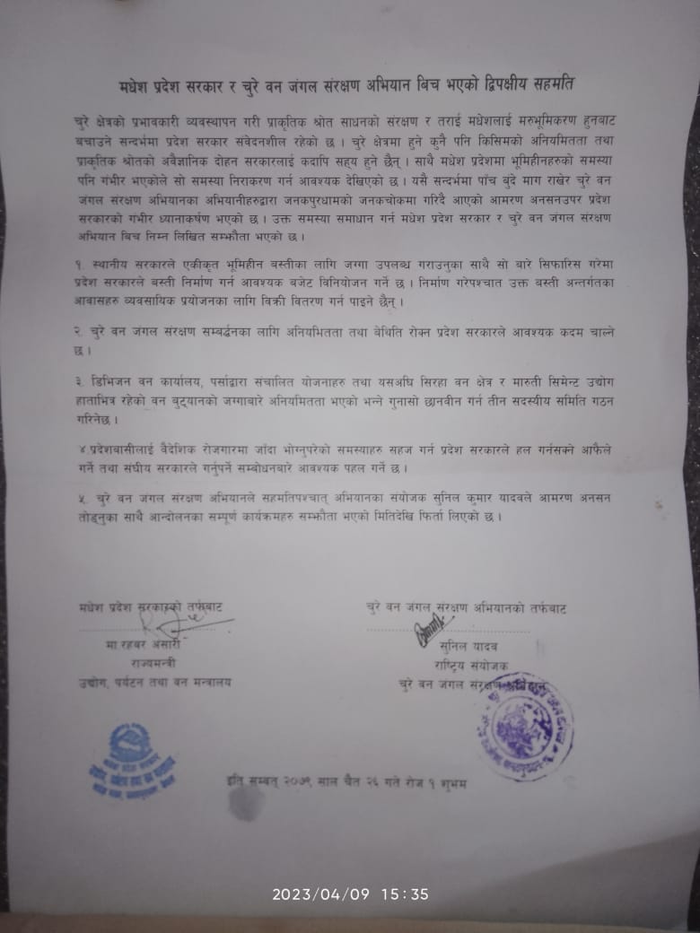 सहमति पत्रमा मधेस प्रदेश सरकारको तर्फबाट उद्योग, पर्यटन तथा वन राज्यमन्त्री मो. रहबर अन्सारी र चुरे तथा वनजंगल संरक्षण अभियानको तर्फबाट अभियानका राष्ट्रिय संयोजक सुनिल यादवले हस्तक्षर गरेका छन् ।