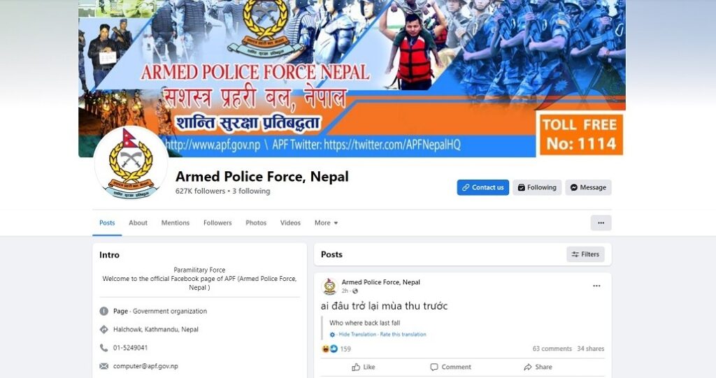 काठमाडौं, २८ चैत । सशस्त्र प्रहरी बलको आधिकारिक फेसबुक पेज ह्याक भएको छ । पेजबाट अनधिकृतरूपमा पोष्टसमेत भएको छ ।