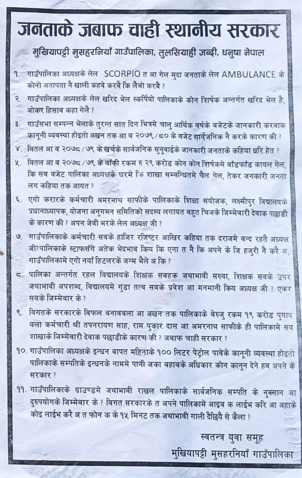 स्वतन्त्र युवा समूहले विगतको सरकारलाई विफल बनाउने र अहिलेसम्म पालिकाको बेरुजु रकम १९ करोड पुर्याउने कर्मचारी तपनारायण साह, रामपुकार दास र अमरनाथ साफीलाई मात्र सबै शाखाको जिम्मेवारी दिनु पछाडिको कारण के रहेको भन्दै अध्यक्षसँग जवाफ मागेका छन् ।