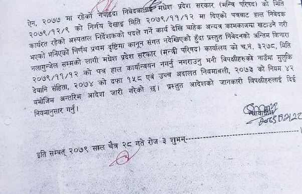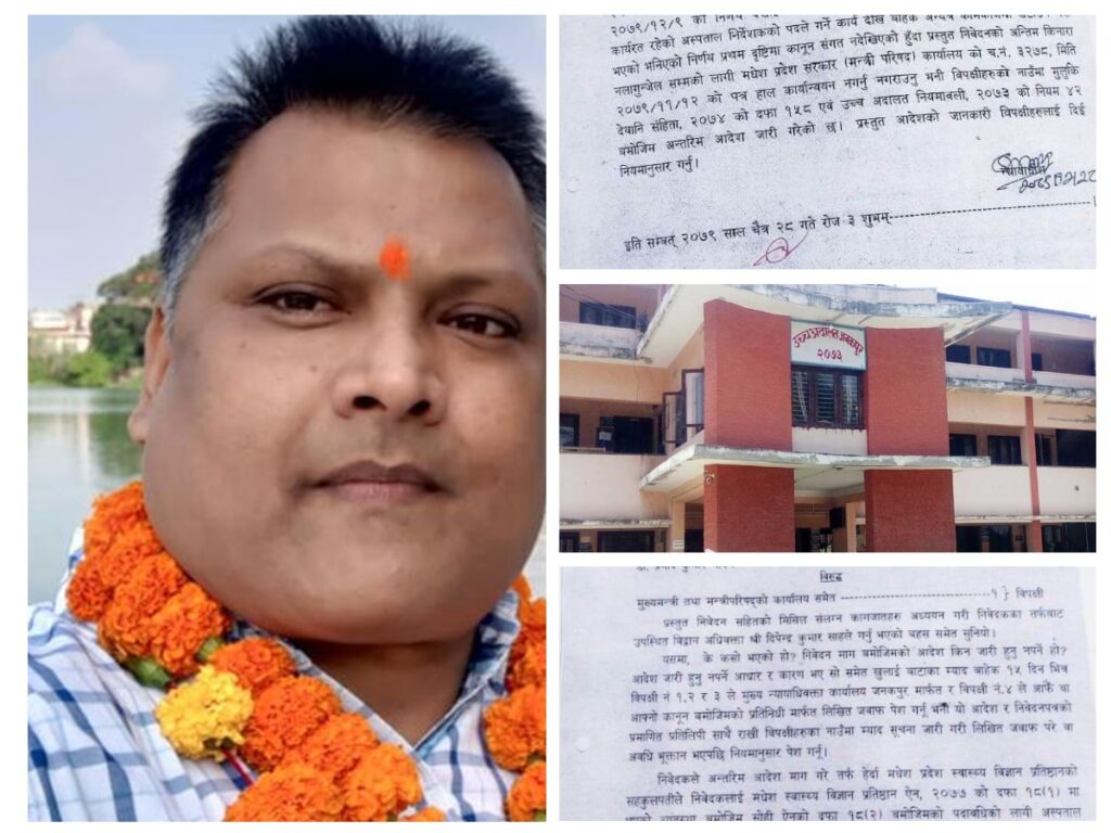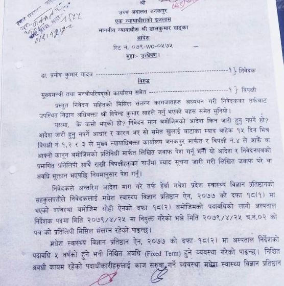 जनकपुरधाम, ४ बैशाख । उच्च अदालत जनकपुरले डाक्टर प्रमोद यादवलाई प्रादेशिक अस्पताल जनकपुरको निर्देशकको रुपमा कामकाज गर्न अन्तरिम आदेश जारी गरेको छ ।