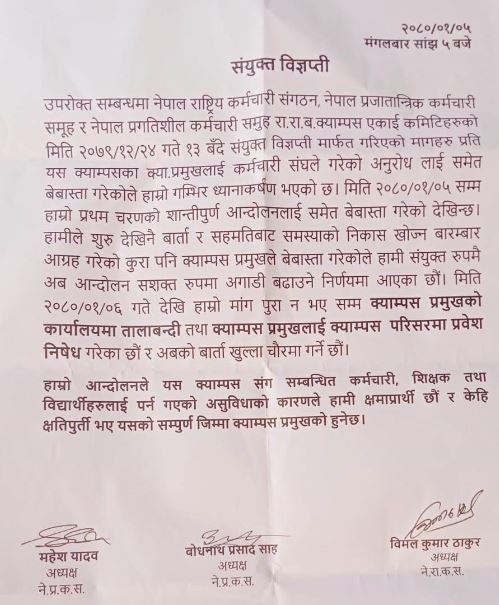 उनीहरुले बुधबार क्याम्पस प्रमुख प्रदिप कुमार प्रसादको कार्यालयमा तालाबन्दी गर्नुका साथै उनलाई क्याम्पस परिसरमासमेत प्रवेश निषेध गर्ने चेतावनी दिएका हुन् ।
