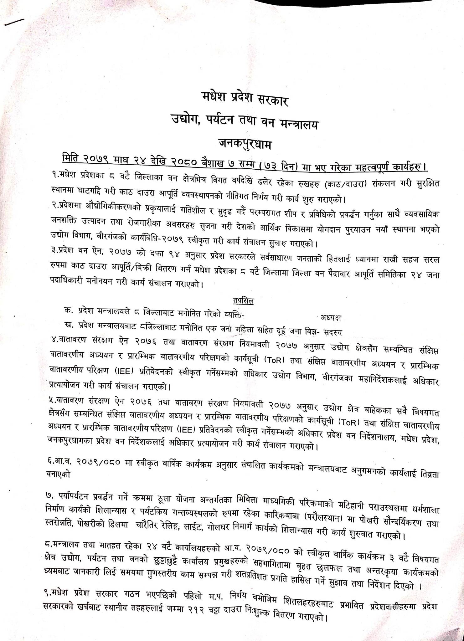 मधेस प्रदेश : उद्योगमन्त्री यादवले गरिन् २१ बुँदे कार्यप्रगति विवरण सार्वजनिक