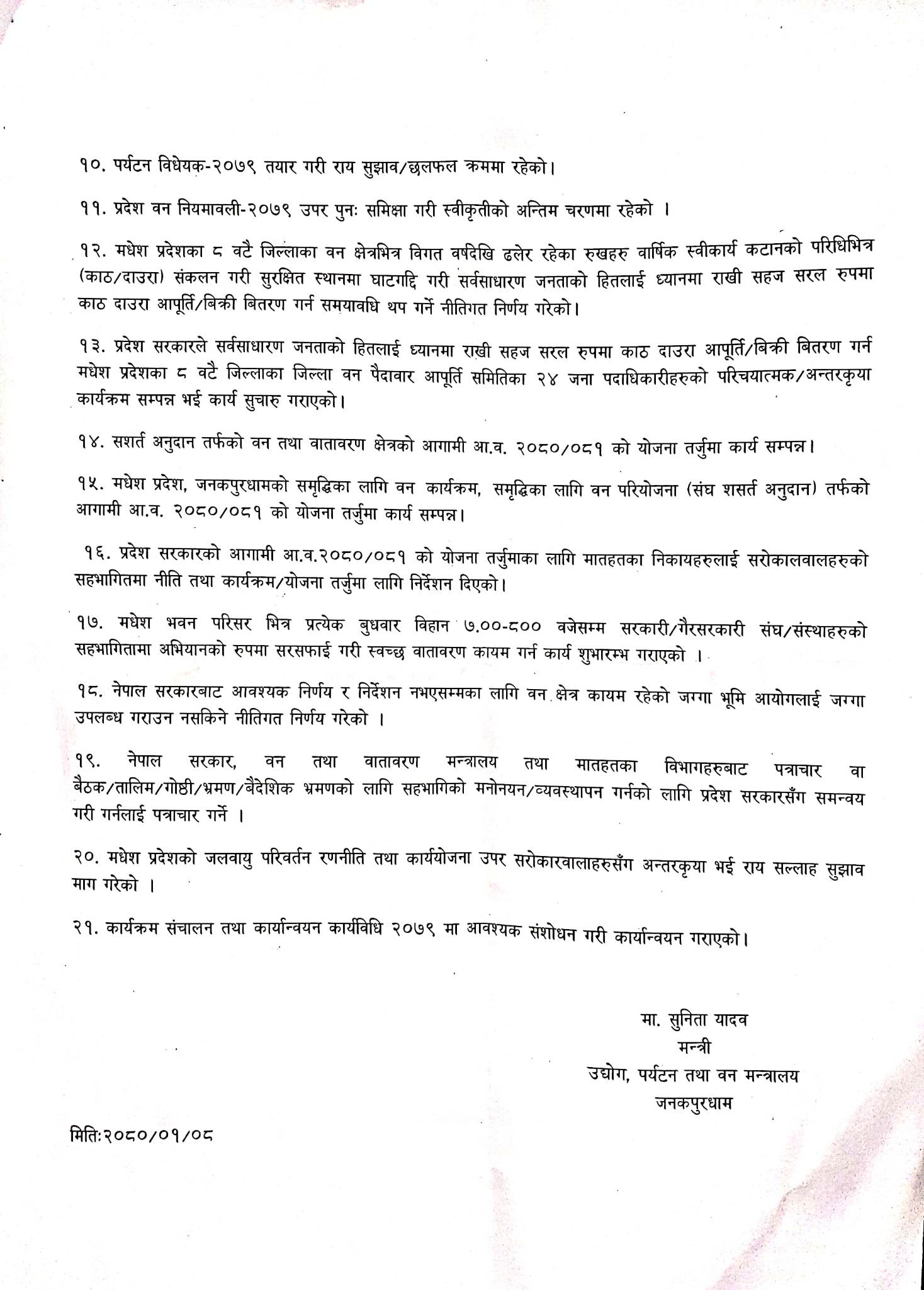 मन्त्री यादवले २१ बुँदे कार्यप्रगति विवरण सार्वजनिक गर्दै गर्न बाँकी रहेका कामहरु पनि क्रमशः पूरा गर्ने प्रतिबद्धतासमेत जनाइन् ।