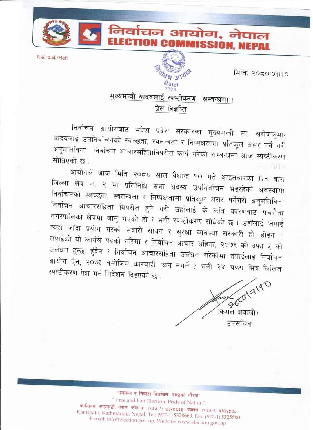 आयोगले आइतबार बारा निर्वाचन क्षेत्र नम्बर–२ मा प्रतिनिधिसभा सदस्यको उपनिर्वाचन भइरहेको समयमा निर्वाचनको स्वतन्त्रता र निष्पक्षतामा प्रतिकूल असर पर्नेगरी अनुमतिबिना आचारसंहिताविपरीत कार्य गरेको र निर्वाचन आचारसंहिता विपरीत हुने गरी के कति कारण पचरौता नगरपालिका क्षेत्रमा गएको हो? भनेर मुख्यमन्त्री यादवसँग स्पष्टीकरण सोधेको हो ।