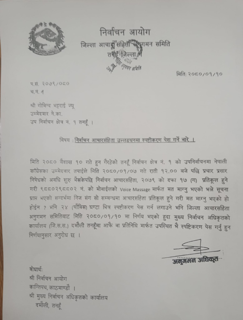 ’वैशाख ७ गते राति १२ बजेपछि प्रचार प्रसार निषेधको अवधि लागु भइसकेको अवस्थामा निर्वाचन आचारसंहिता, २०७९ को दफा १७ (ग) प्रतिकूल हुने गरी मोबाइलको भ्वाइस म्यासेजमार्फत मत माग्नु भएको भन्ने सूचना प्राप्त भएको सन्दर्भमा निजसँग सो सम्बन्धमा आचारसंहिता प्रतिकूल हुने गरी मत माग्नु भएको हो होइन? भनि २४ घण्टाभित्र स्पष्टीकरण पेस गर्न लगाउने भनि जिल्ला आचारसंहिता अनुगमन समितिबाट आइतवार निर्णय भएको हुँदा मुख्य निर्वाचन अधिकृतको कार्यालय (जि.स.स.) दमौली तनहुँमा आफैँ वा प्रतिनिधिमार्फत उपस्थित भइ स्पष्टीकरण पेस गर्नुहुन निर्णयानुसार अनुरोध छ’, आयोगका अनुगमन अधिकृतले भनेका छन् ।