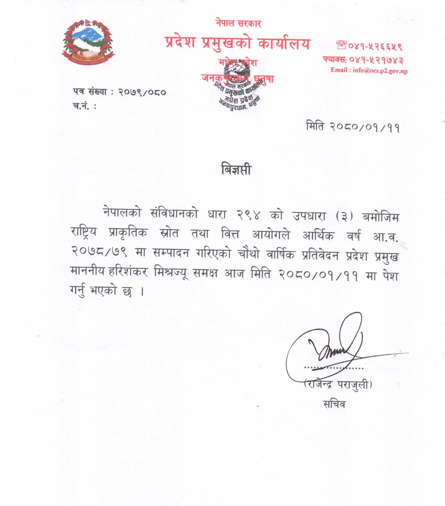 प्रदेश प्रमुखको कार्यालयका सचिव राजेन्द्र पराजुलीले नेपालको संविधानको धारा २९४ को उपधारा (३) बमोजिम आयोगले आर्थिक वर्ष २०७८/७९ मा सम्पादन गरिएको चौथो वार्षिक प्रतिवेदन प्रदेश प्रमुख हरिशंकर मिश्रसमक्ष पेश गरेको जानकारी दिए ।