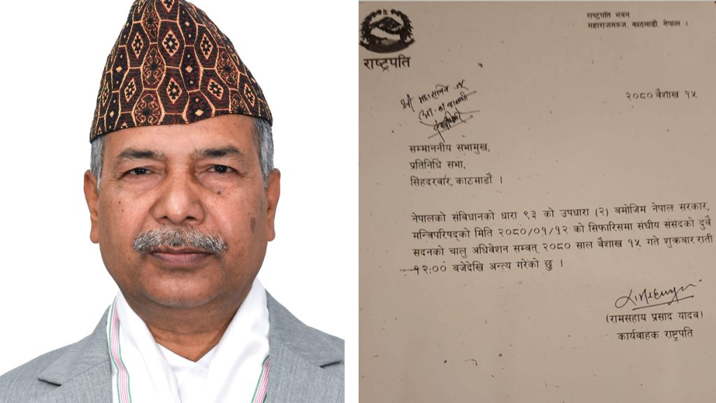 कार्यवाहक राष्ट्रपति यादवले संविधानको धारा ९३ को उपधारा (२) बमोजिम मन्त्रिपरिषद्ले वैशाख १२ गते गरेको सिफारिसका आधारमा शुक्रबार राति १२ बजेपछि संसदको अधिवेशन अन्त्य गरेको बताएका छन् ।