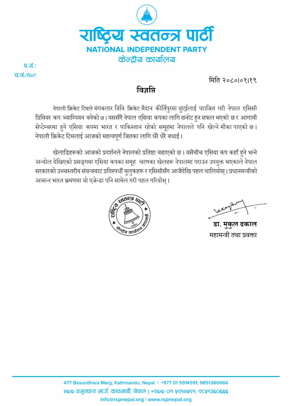मंगलबार एसिसी प्रिमियर कप फाइनलमा यूएईलाई ७ विकेटले हराउँदै नेपालले एसिया कपमा स्थान बनाएलगत्तै विज्ञप्ति जारी गर्दै रास्वपाले यस्तो बताएको हो ।