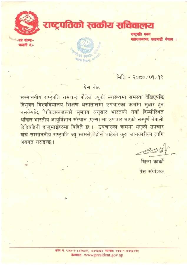 छातीमा समस्या देखिएपछि त्रिवि शिक्षण अस्पतालमा उपचार गराएका राष्ट्रपति पौडेल चिकित्सकहरुको सुझावका आधारमा ६ वैशाखमा भारतको नयाँदिल्लीस्थित अखिल भारतीय आयुर्विज्ञान संस्थान (एम्स) मा उपचारका लागि गएका थिए । त्यहाँ ११ दिनको उपचारपछि राष्ट्रपति पौडेल आइतबार राति स्वदेश फर्किएका थिए ।