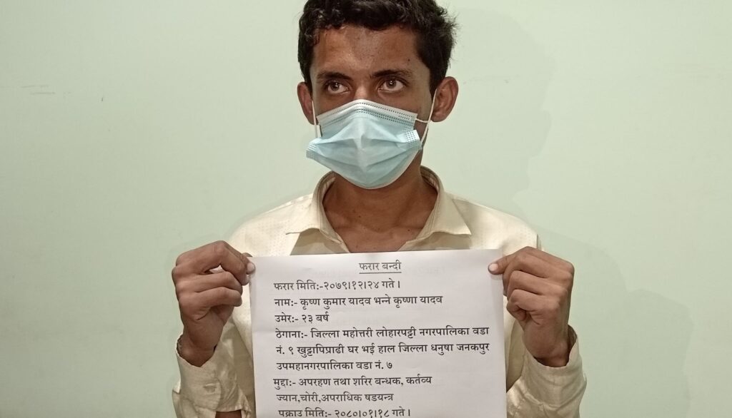 उनलाई खोजतलास गर्ने क्रममा सोमबार राति १० बजे जलेश्वर नगरपालिका–३ स्थित मलिबाराबाट पक्राउ गरिएको जिल्ला प्रहरी कार्यालय महोत्तरीका प्रवक्ता प्रहरी नायव उपरीक्षक दिलीपकुमार गिरीले जानकारी दिए ।