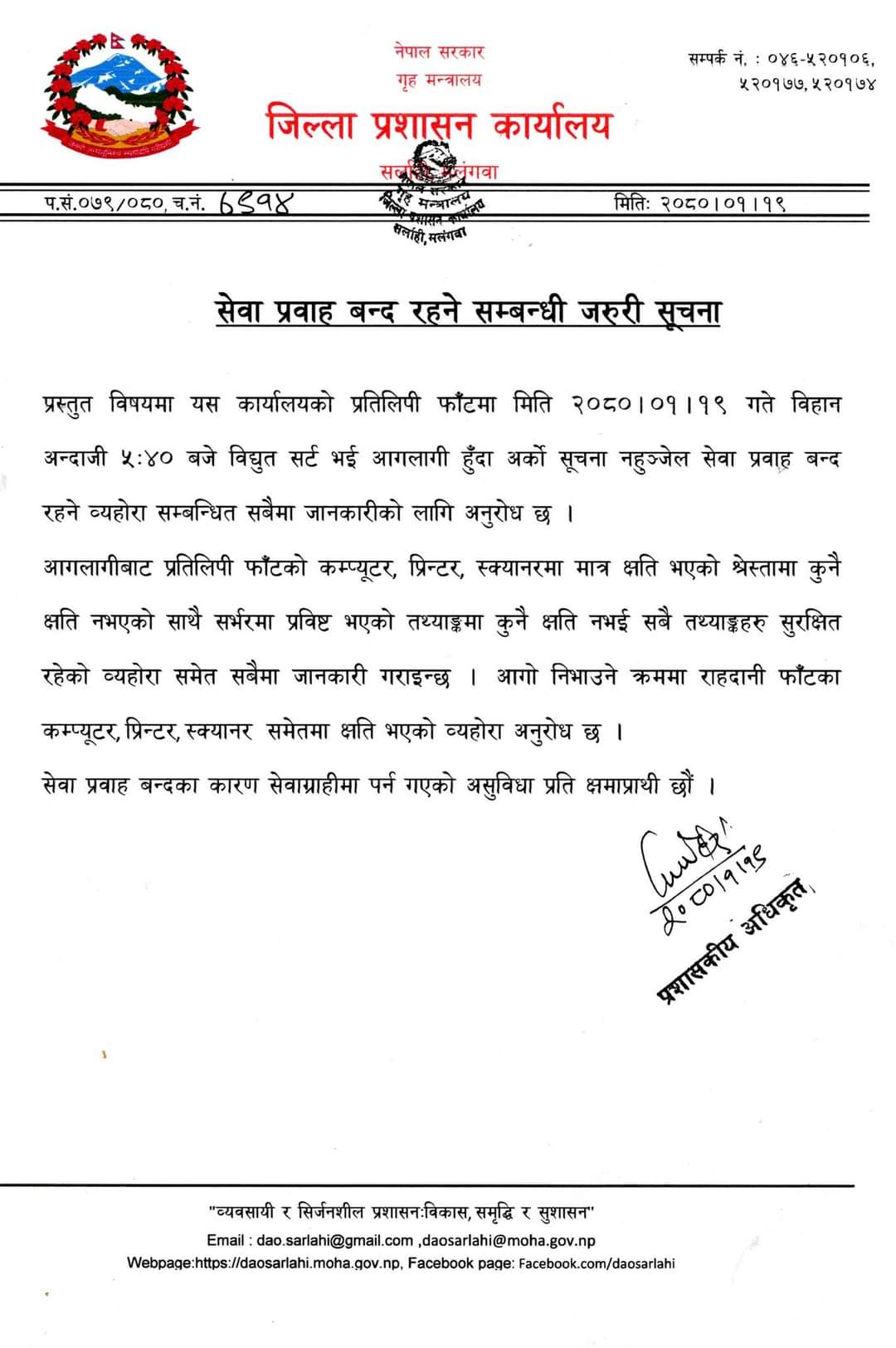 प्रशासकीय अधिकृत थापाले अर्को सूचना नहुञ्जेल जिल्ला प्रशासन कार्यालय सर्लाहीको सेवा प्रवाह बन्द रहने जानकारी दिएका छन् ।