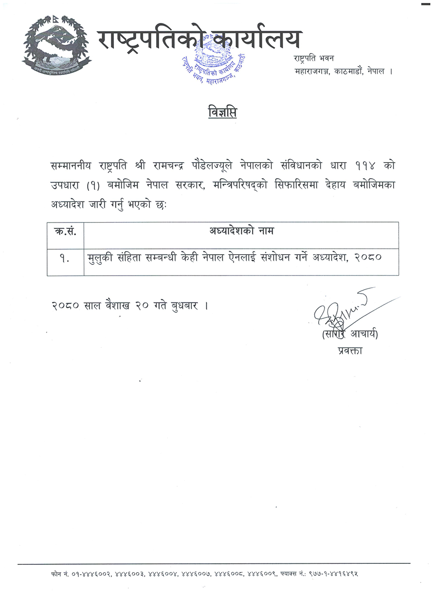 राष्ट्रपति कार्यालयका प्रवक्ता सागर आचार्यका अनुसार राष्ट्रपति पौडेलले नेपालको संविधानको धारा ११४ को उपधारा (१) बमोजिम मन्त्रिपरिषद्को सिफारिसमा मुलुकी संहिता सम्बन्धी केही नेपाल ऐनलाई संशोधन गर्ने अध्यादेश, २०८० जारी गरेका हुन् ।