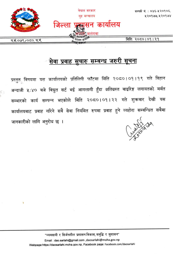 मंगलबार विद्युत् सर्ट भएर जिल्ला प्रशासन कार्यालय सर्लाहीमा आगलागी भई विभिन्न उपकरणमा क्षति पुगेपछि सेवा अवरुद्ध गरिएको थियो ।