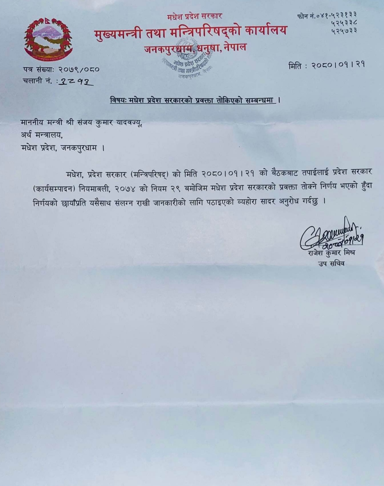 जनकपुरधाम, २१ बैशाख । मधेस प्रदेश सरकारको प्रवक्ताको जिम्मेवारी अर्थमन्त्री संजयकुमार यादवलाई तोकिएको छ ।