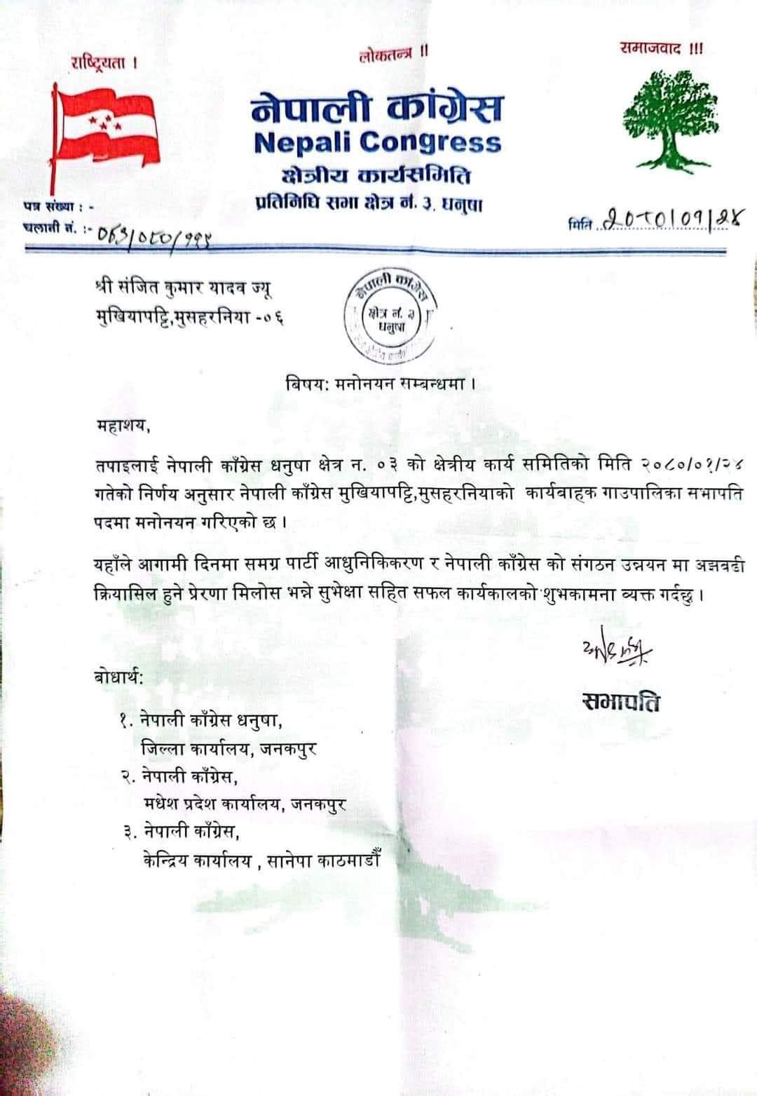 नेपाली कांग्रेसले आइतबार नै धनुषाको मुखियापट्टि मुसरनिया गाउँपालिकाको नगर कार्यबाहक सभापतिको जिम्मेवारी संजित कुमार यादवलाई दिएको छ ।