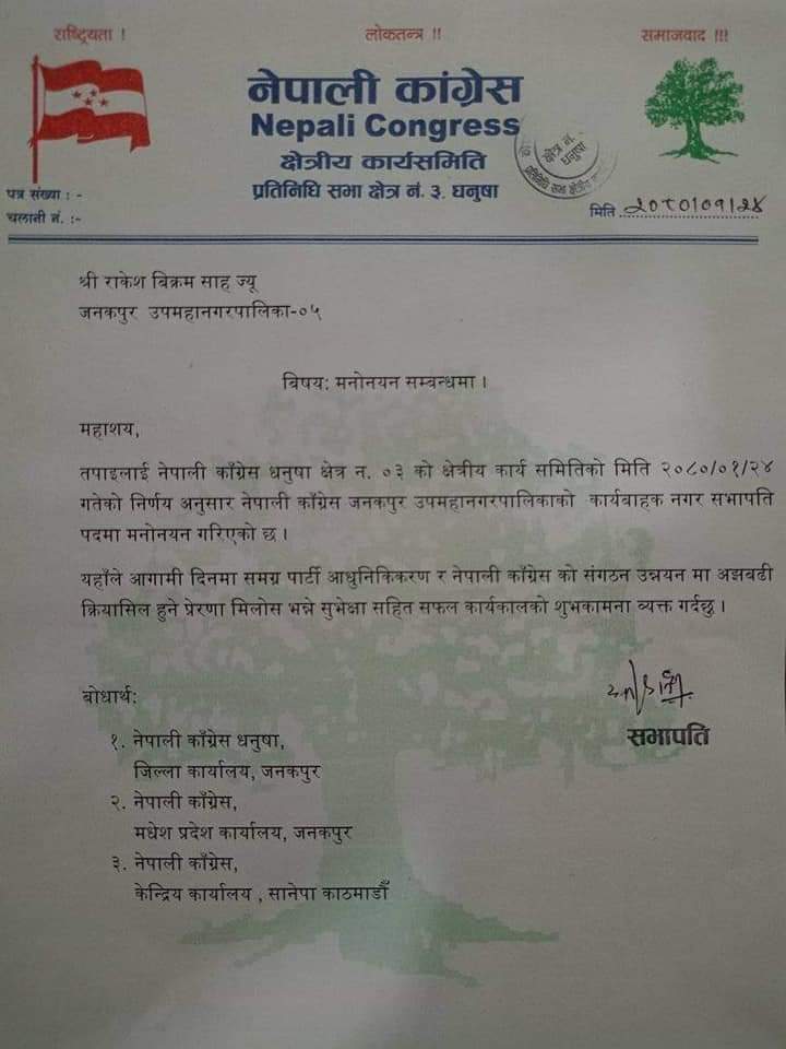 कांग्रेसले आइतबार जनकपुरधाम उपमहानगरपालिकाको कार्यबाहक नगर सभापति पदमा युवा नेता राकेश विक्रम साहलाई मनोनयन गरेको हो ।