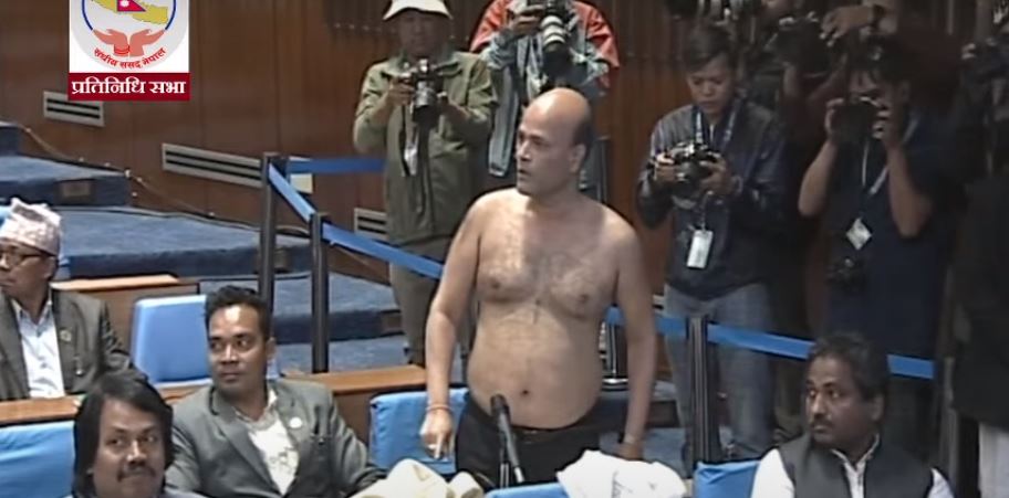 सभामुख देवराज घिमिरेको विरोध गर्दै सांसद सिंहले आफ्नो कोट, सर्ट र गन्जी खोलेर अर्धनग्न भएका थिए ।