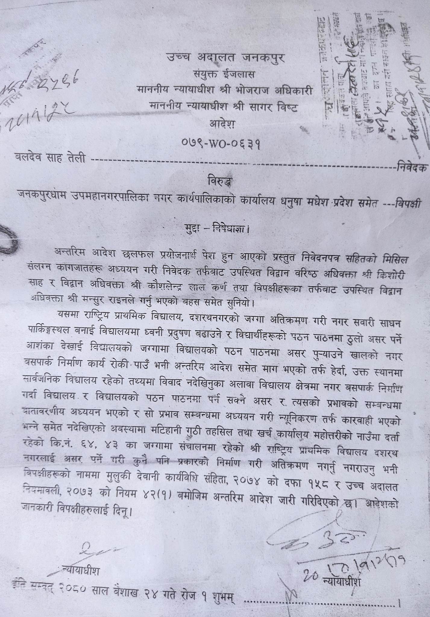 उच्च अदालत जनकपुरका न्यायाधीशद्व भोजराज अधिकारी र सागर विष्टको संयुक्त इजलासले यस्तो आदेश जारी गरेको हो ।