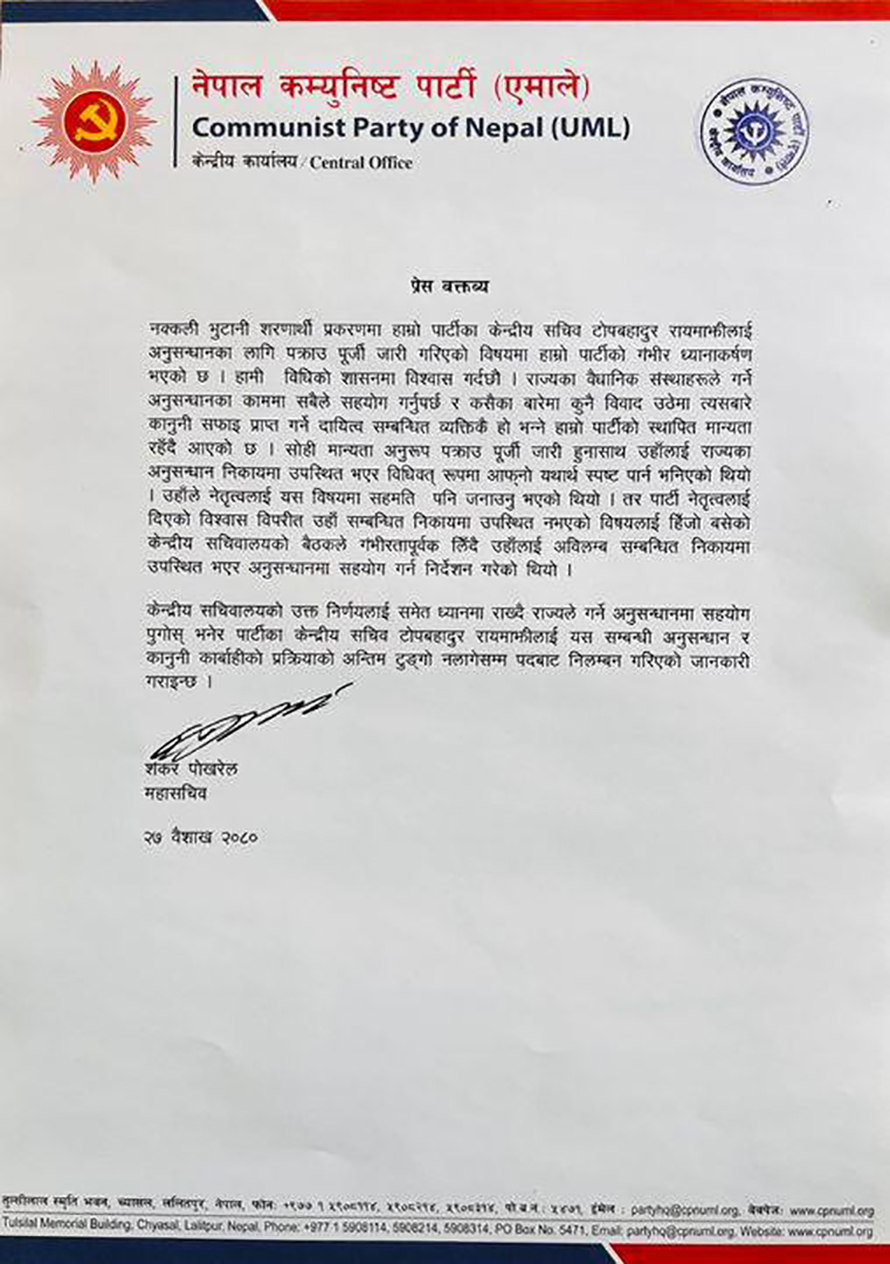 सोही मान्यता अनुरूप पक्राउ पूर्जी जारी हुनासाथ उनलाई राज्यका अनुसन्धान निकायमा उपस्थित भएर विधिवत् रूपमा आफ्नो यथार्थ स्पष्ट पार्न भनिएको विज्ञप्तिमा उल्लेख छ । उनले सुरुमा नेतृत्वसँग यस विषयमा सहमति पनि जनाएको एमालेले जनाएको छ ।