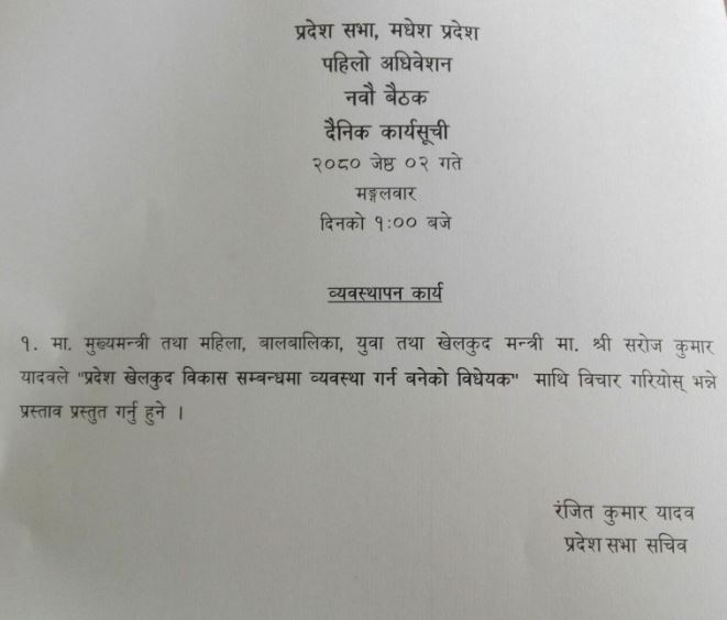 आजको बैठकमा मुख्यमन्त्री तथा महिला, बालबालिका, युवा तथा खेलकुद मन्त्रीसमेत रहेका सरोजकुमार यादवले ‘प्रदेश खेलकुद विकास सम्बन्धमा व्यवस्था गर्न बनेको विधेयक’ माथि विचार गरियोस् भन्ने प्रस्ताव प्रस्तुत गर्ने कार्यसूची रहेको प्रदेश सभा सचिवालयले जनाएको छ ।