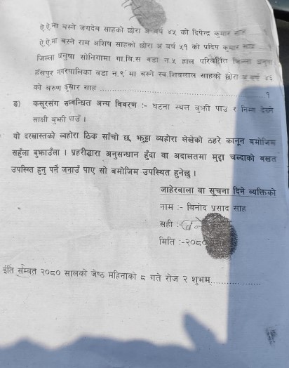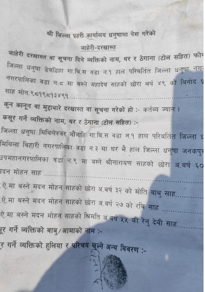 जिल्लाको नगराइन नगरपालिका–८ खिरखिरिया बस्ने विनोद प्रसाद साहकी २२ वर्षीया छोरी आरतीकुमारी साहको उनका श्रीमान् मोतीबाबु साह, ससुरा मदन मोहन साह, सासु रेणु देवी साह र देवर रवि साह मिलेर हत्या गरेको मृतकका बुबा विनोद प्रसाद साहले आरोप लगाएका छन् ।