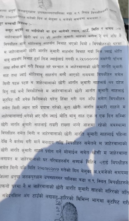 जनकपुरधाम, ८ जेठ । दाइजोका कारण धनुषामा एक महिलाको हत्या गरिएको मृतकका माइती पक्षले आरोप लगाएको छ । जिल्लाको मिथिला बिहारी नगरपालिका–३ मिथिलेश्वर मौवाही घर भई हाल जनकपुरधाम–९ थापा चोकमा बस्दै आएका श्रीमान, सासु, ससुरा र देवर मिलेर महिलाको हत्या गरेको उनको माइती पक्षले आरोप लगाएको हो ।