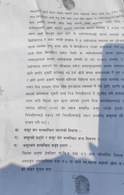 यता, प्रहरीले घटनाको थप अनुसन्धान गरिरहेको जिल्ला प्रहरी कार्यालय धनुषाका प्रवक्ता प्रहरी नायब उपरीक्षक बेदप्रसाद गौतमले जानकारी दिए । उनले भने, ‘पोष्टमार्टमको रिपोर्ट आएपछि मात्र आत्महत्या वा हत्या भन्न सकिन्छ । यसका लागि प्रहरीले सुक्ष्म अनुसन्धान गरिरहेको छ ।’
