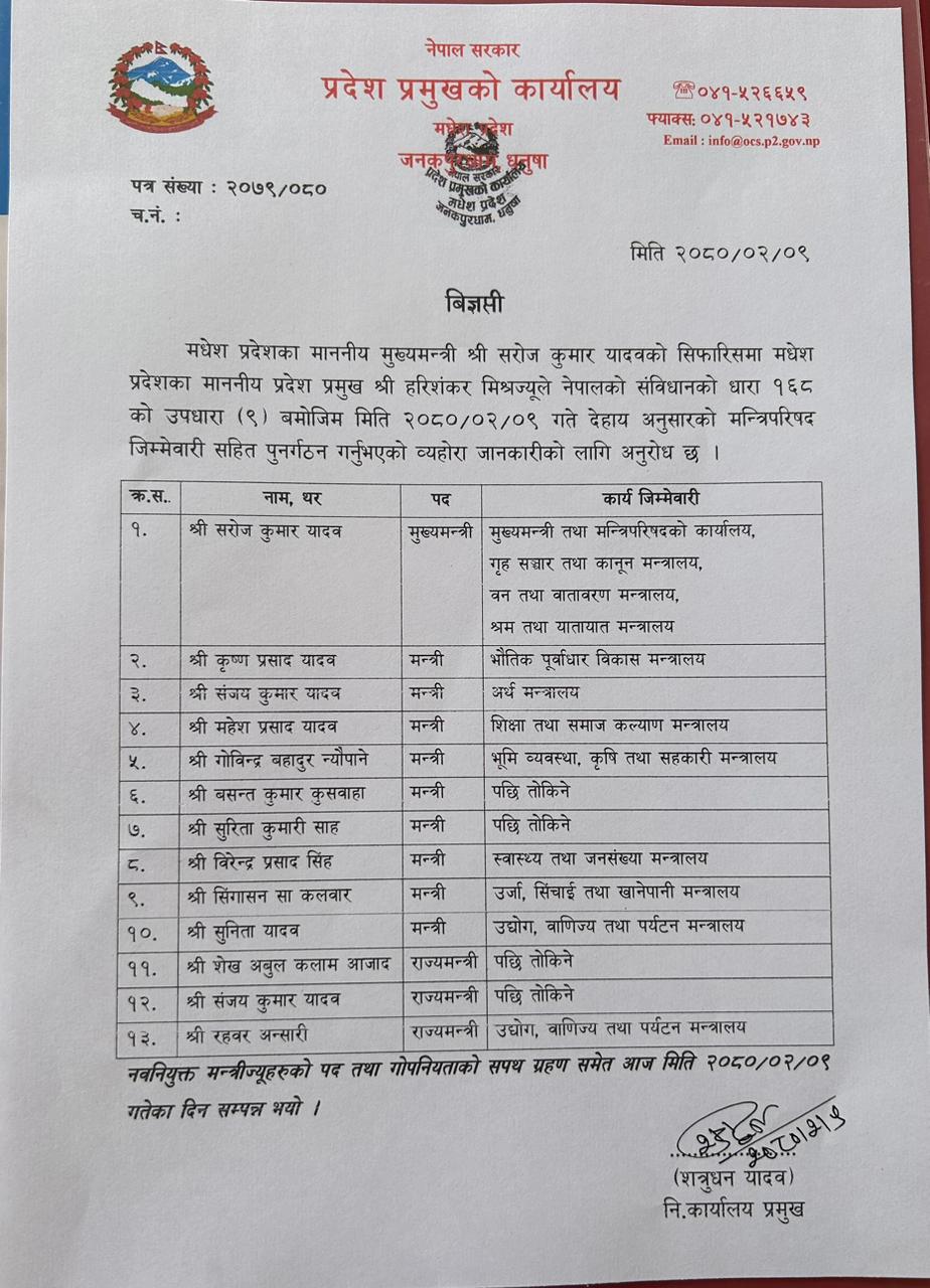 १४ चैतमा मधेस प्रदेश सरकारले मन्त्रालयहरूको नाम हेरफेर गरेपनि सोअनुसार मन्त्रीको जिम्मेवारी तोकिएको थिएन । प्रदेश मन्त्रिपरिषद्को बैठकले प्रदेश सरकार कार्य विभाजन नियमावली–२०७९ को अनुसूचीमा हेरफेर गर्दै प्रदेशका मन्त्रालयहरूको नाम समायोजन गरिएको थियो ।