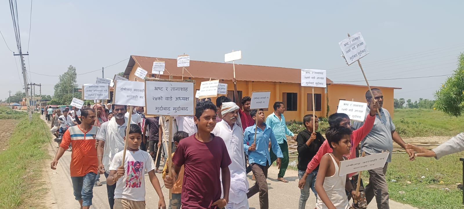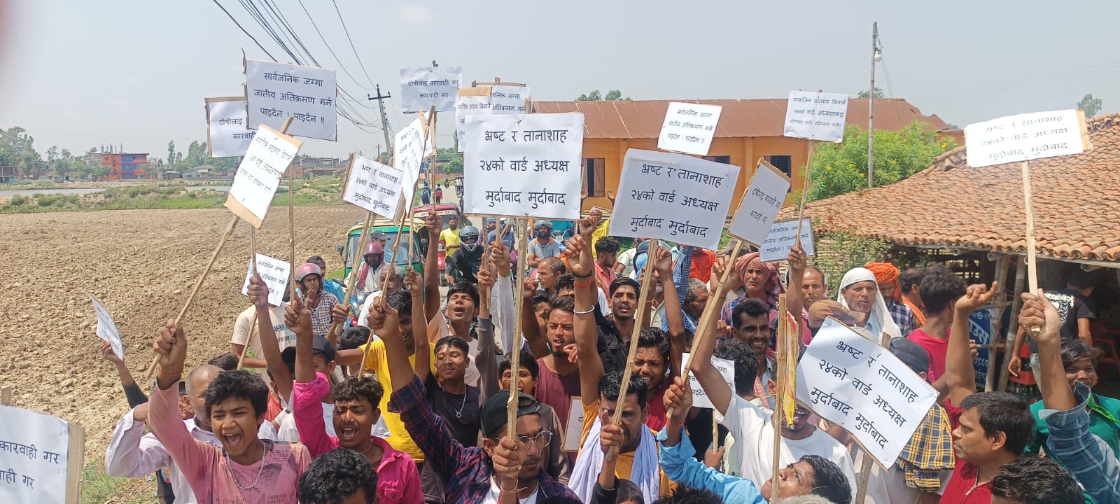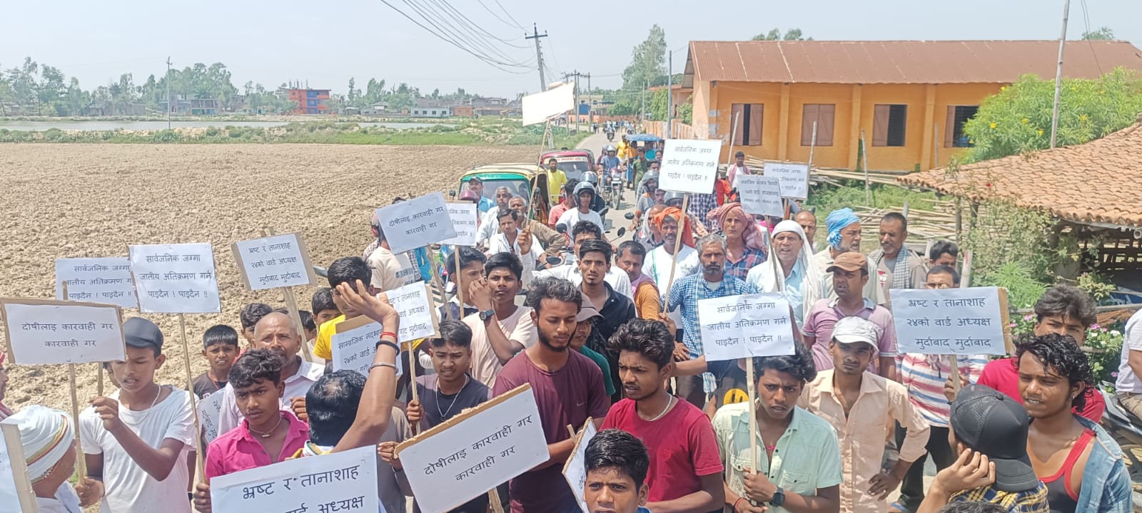 उनीहरुले सार्वजनिक जग्गा जातीय अतिक्रमण गर्न पाइदैन, भ्रष्ट र तानाशाह वडाध्यक्ष मुर्दावाद, दोषीलाई कारवाही गर, सामाजिक सदभाव कायम गरलगायतका मागसहितको प्लेकार्ड बोकेर प्रदर्शन गरेका छन् ।