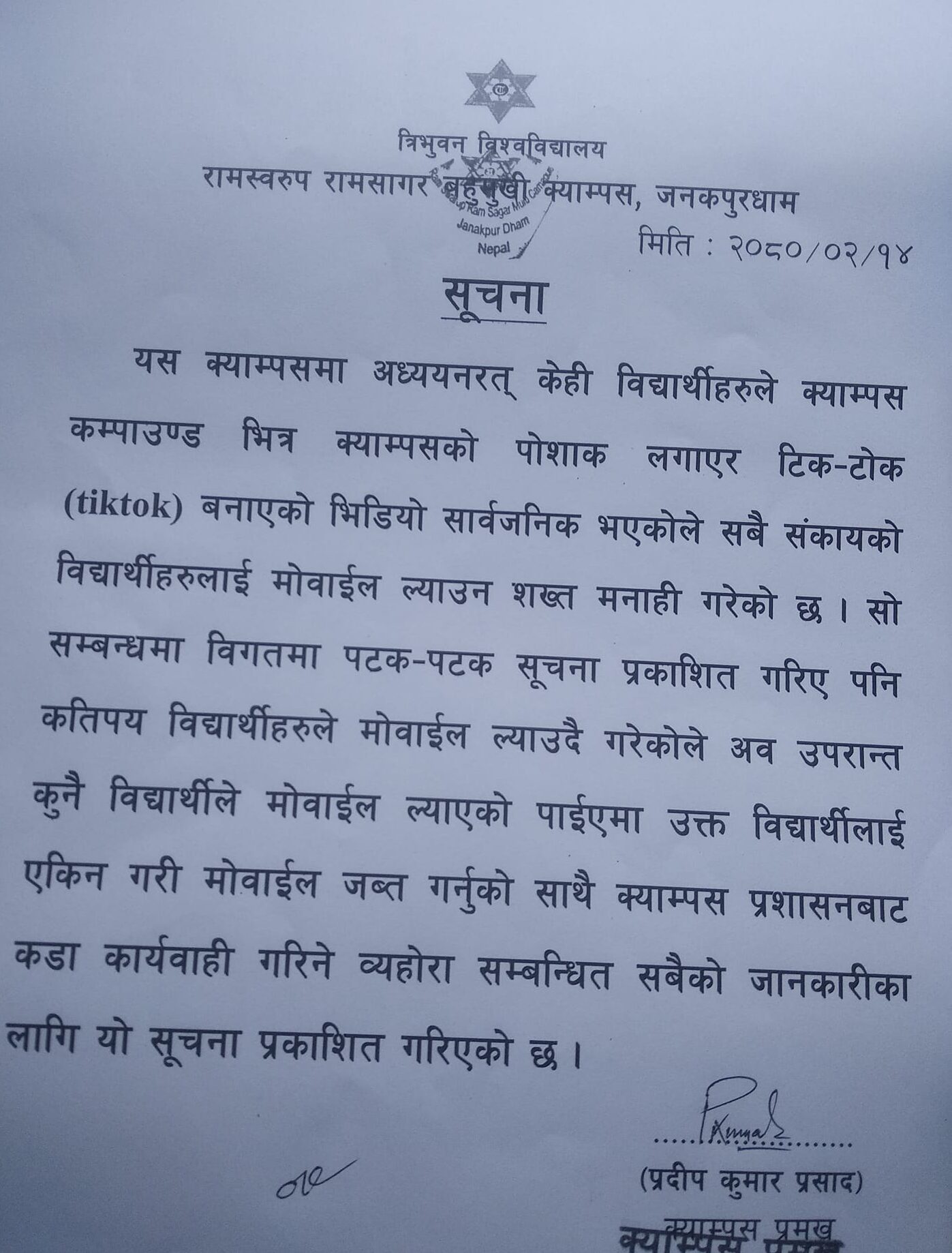यस क्याम्पसमा अध्ययनरत् केही विद्यार्थीहरुले क्याम्पस कम्पाउण्डभित्र क्याम्पसको पोशाक लगाएर टिकटक बनाएको भिडियो सार्वजनिक भएकोले सबै संकायको विद्यार्थीहरुलाई मोवाइल ल्याउन रोक लगाइएको हो ।