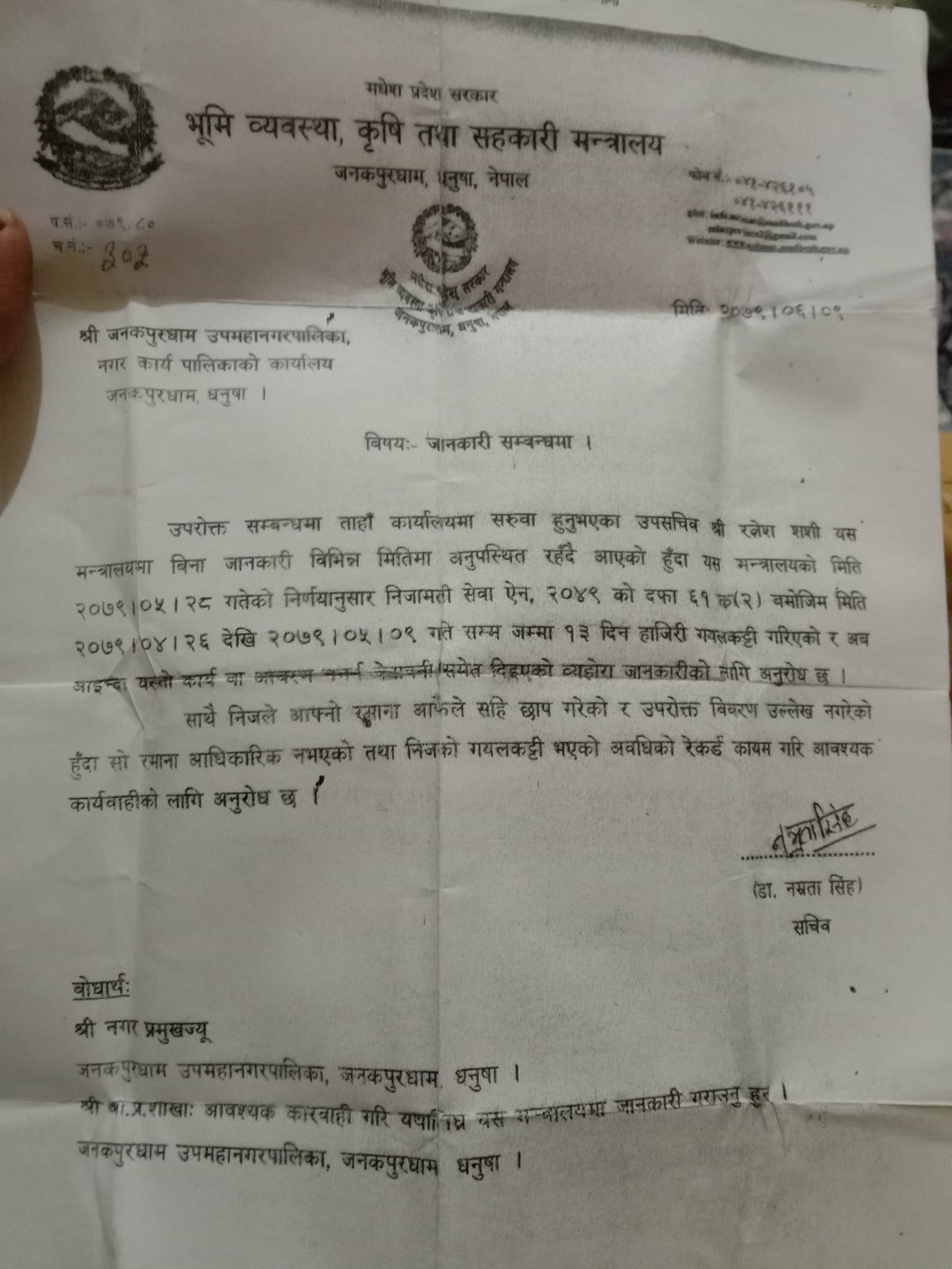 जनकपुरधाम उपमहानगरपालिकाको कार्यालयमा जान लालायित रहेका उपसचिव शशीलाई कारवाही गर्न मधेस प्रदेशको भूमि व्यवस्था, कृषि तथा सहकारी मन्त्रालयले पत्र काटेको छ ।