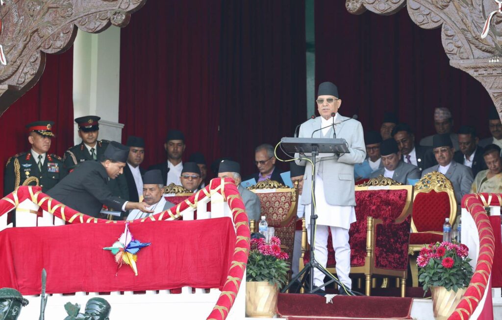 ‘गणतन्त्रलाई संस्थागत गर्ने क्रममा हाम्रा सामु कैयौँ चुनौती देखिए पनि हामीले नेपालमा संघीय लोकतान्त्रिक गणतन्त्रलाई समावेशी लोकतन्त्रको अभ्यास गर्ने उत्कृष्ट व्यवस्थाका रूपमा स्थापित गर्न पहल गरिरहेका छौँ । नेपाली समाजको संरचना तथा भौगोलिक विशिष्टतालाई सम्बोधन गर्न संघीयता, समावेशिता एवं समानुपातिक प्रतिनिधित्वको सिद्धान्त अङ्गीकार गरिएको छ’, उनले भने, ‘विश्वब्यापीरूपमा स्थापित लोकतन्त्रका आधारभूत सिद्धान्त र नेपाली समाजको विशेषता अनुकूलका चरित्र थप गरिएको संघीय लोकतान्त्रिक गणतन्त्र नेपालको मौलिक राजनीतिक प्रणाली हो भन्ने तथ्य स्थापित हुँदै गएको छ ।